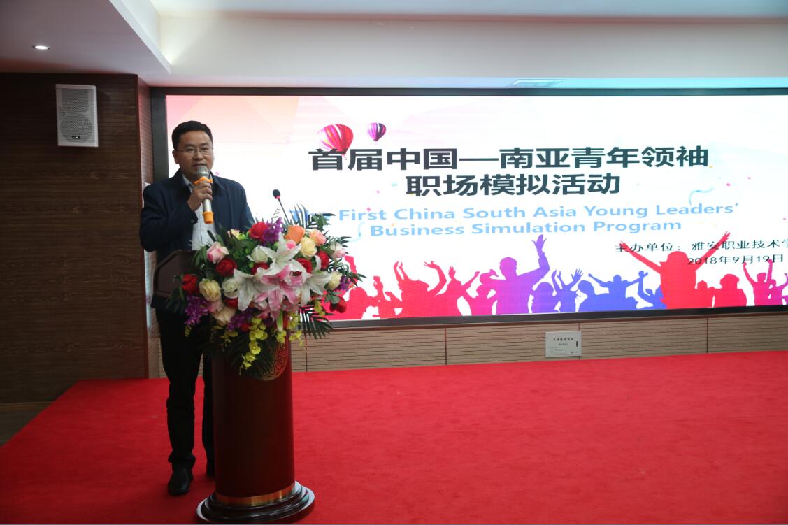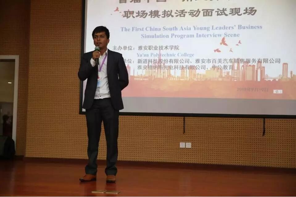 On 19 September, the first China-South Asia Young Leaders Career Simulation Event was successfully held at the Youth Road Campus. The event was hosted by the college, co-organized by Xindao Technology Co., Ltd, Ya'an Baimei Auto Sales & Service Co., Ltd, Ya'an Glas Photoelectric Technology Co., Ltd and Zhong Gong Education, with Yang Shanghai, Director of Sichuan Talent Exchange Centre, Hao Lan, Director of Ya'an Talent Exchange Centre, Song Lizhi, member of the Party Committee of the college and Director of Adult Education and Training Department, Song Feng, Director of Admissions and Employment Department, 23 young leaders from India, Nepal, Sri Lanka, the 23 representatives of youth leaders from four countries of India, Nepal, Sri Lanka and Maldives and 10 representatives of young students from the Chinese side, all members of the College's Student Innovation and Entrepreneurship Club and representatives of students from the Department of Education, the Department of Travel and Economics and the Department of Nursing attended in total more than 200 people.