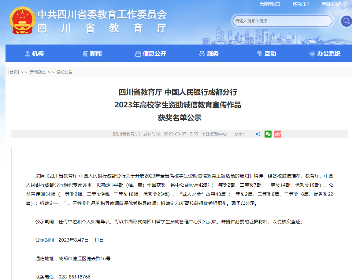 近日,四川省教育厅公布了2023年全省高校学生资助诚信教育宣传作品评选结果,经过各校遴选推荐、专家评审,最终评选出144部作品获奖,其中,学院遴选推荐的公益宣传画《诚信为本·建设基石》和公益短片《诚信是“金”》分别荣获二等奖和优秀奖。本次诚信教育活动由四川省教育厅和中国人民银行成都分行联合组织,旨在全面贯彻落实党的二十大和二十届一中、二中全会精神,认真贯彻落实习近平总书记关于教育的重要论述,坚持和加强...