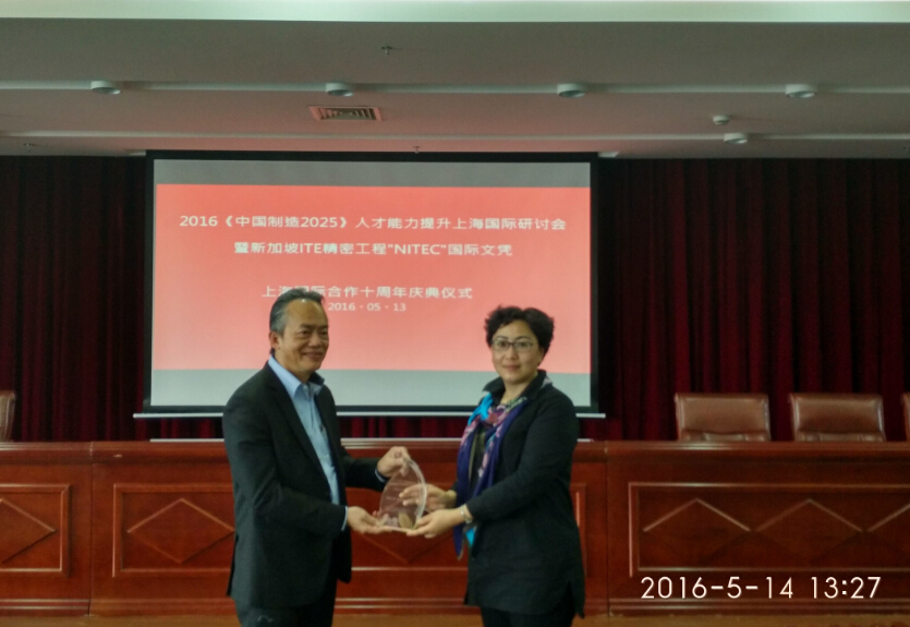 【本网讯】5月13日,机电系王梅副主任赴参加2016《中国制造2025》人才能力提升上海国际研讨会暨新加坡国家工艺教育学院ITE精密工程“NITEC国际文凭”上海合作课程十周年庆典,会议由上海应用技术培训中心、中国(上海...