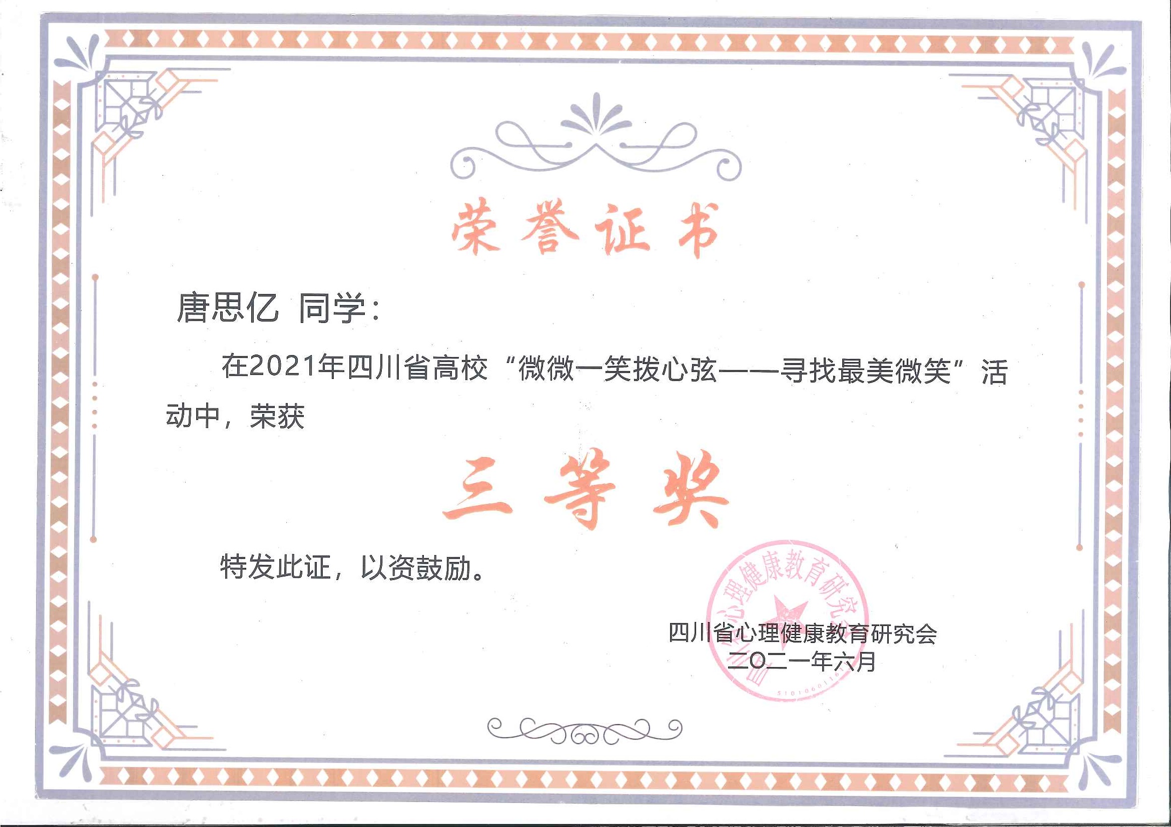 为庆祝中国共产党成立 100 周年,展现新时代大学生的良好精神风貌,四川省心理健康教育研究会联合西南石油大学举办“2021年四川省‘微微一笑拨心弦—寻找最美微笑’”活动。 学院积极组织开展活动,接到各二级学...