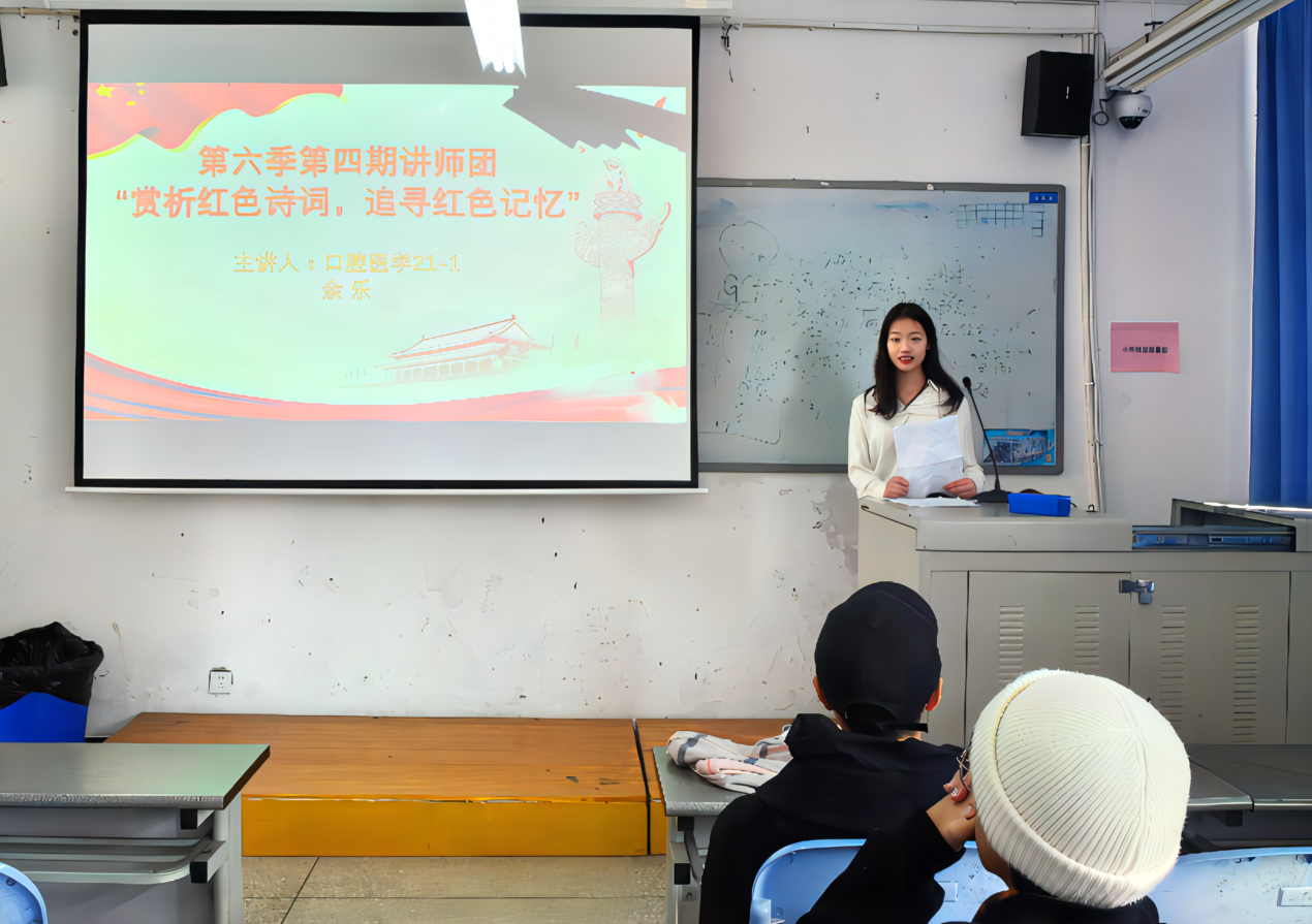 12月21日,由院团委宣传中心主办的“赏析红色诗词,追寻红色记忆”学生讲师团第六季第四期在青年路校区图附204教室顺利举行,本次讲座由学生讲师团成员姚如菲、李宇涵两位同学主讲,学生代表120余人参与讲座。 主...