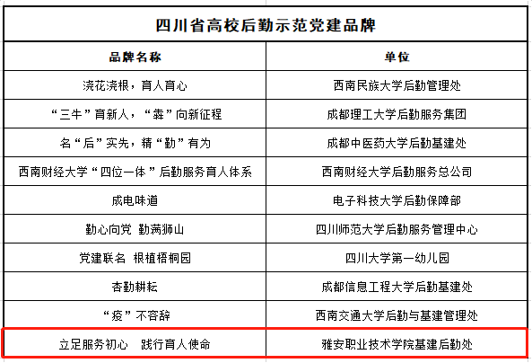 近日,由四川省高校后勤协会思想政治工作委员会主办的“四川省高校后勤党建品牌创建活动”评选结果揭晓,学院机关后勤第二党总支第三党支部申报的“立足服务初心 践行育人使命”党建品牌荣获“四川省高校后勤示范党建品牌”。此次活动,全省共129所高校(本科、专科)申报,经片区筛选,推荐出了21所高校参加评审。现场各推选高校首先进行汇报演讲,然后由评审团打分,经过近3个小时的激烈角逐,最终确定了10所高校获得“高校后...