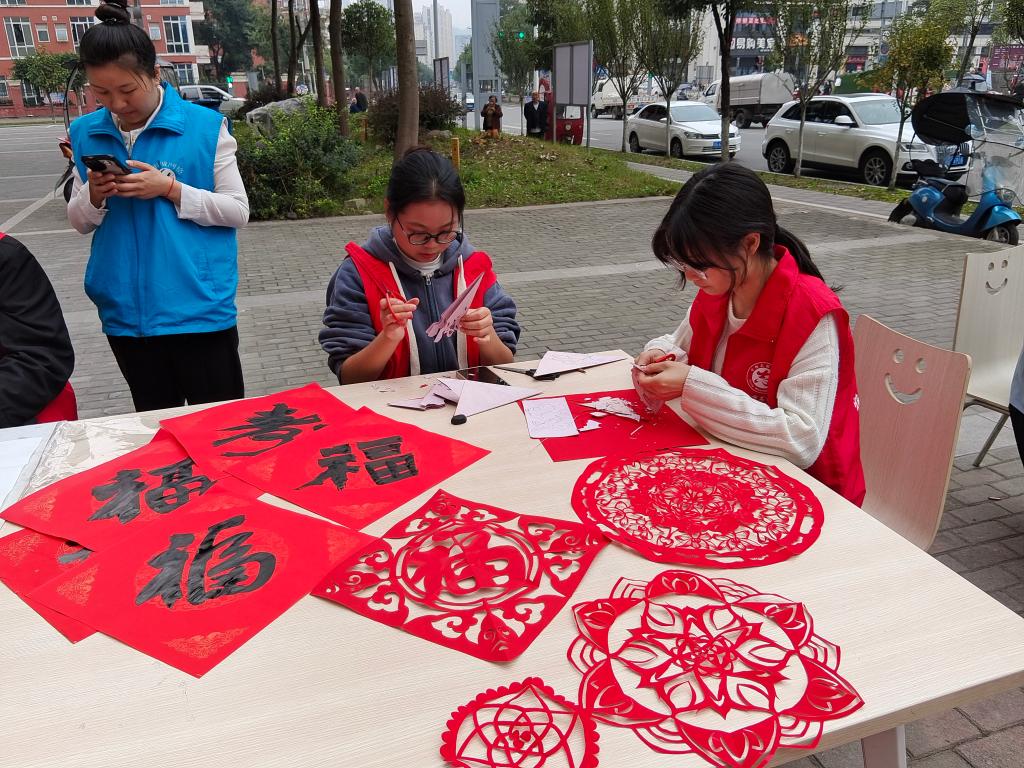 为弘扬中华民族尊老、爱老、敬老、助老的传统美德,丰富老年人的精神文化生活,在重阳节到来之际,10月23日上午,师范学院组织青年服务志愿者参加了由雅安市穆家社区举办的重阳节爱老、敬老活动。学生志愿者发挥专业所长和爷爷奶奶们一道写“福”送“寿”,画吉祥牡丹图,剪红火的窗花,现场人员涌动,欢声笑语不断,为重阳节增添了浓厚的欢乐气氛