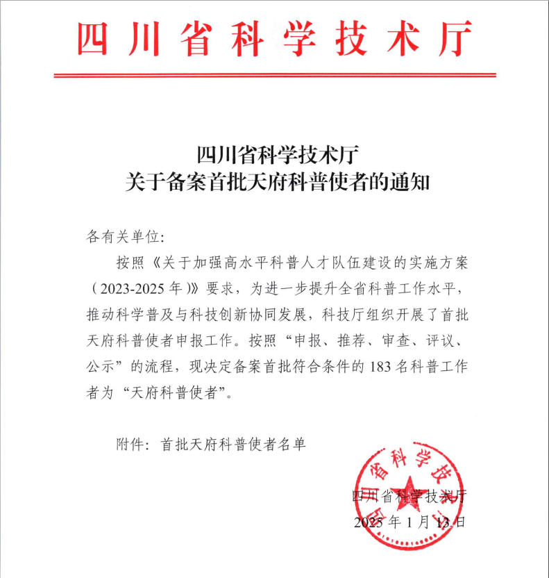 01-18-2025学校教师入选四川省科学技术厅 “天府科普使者”