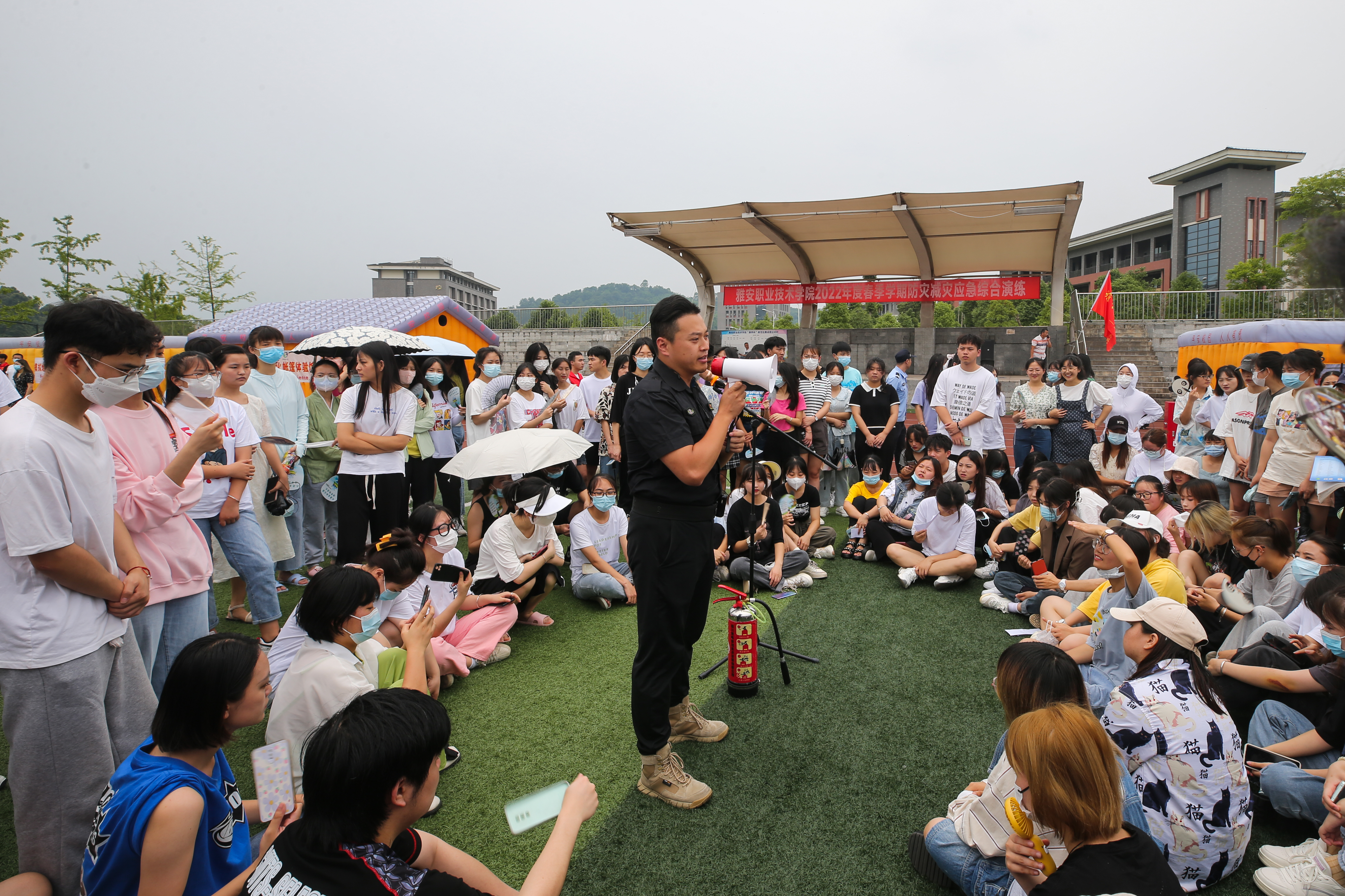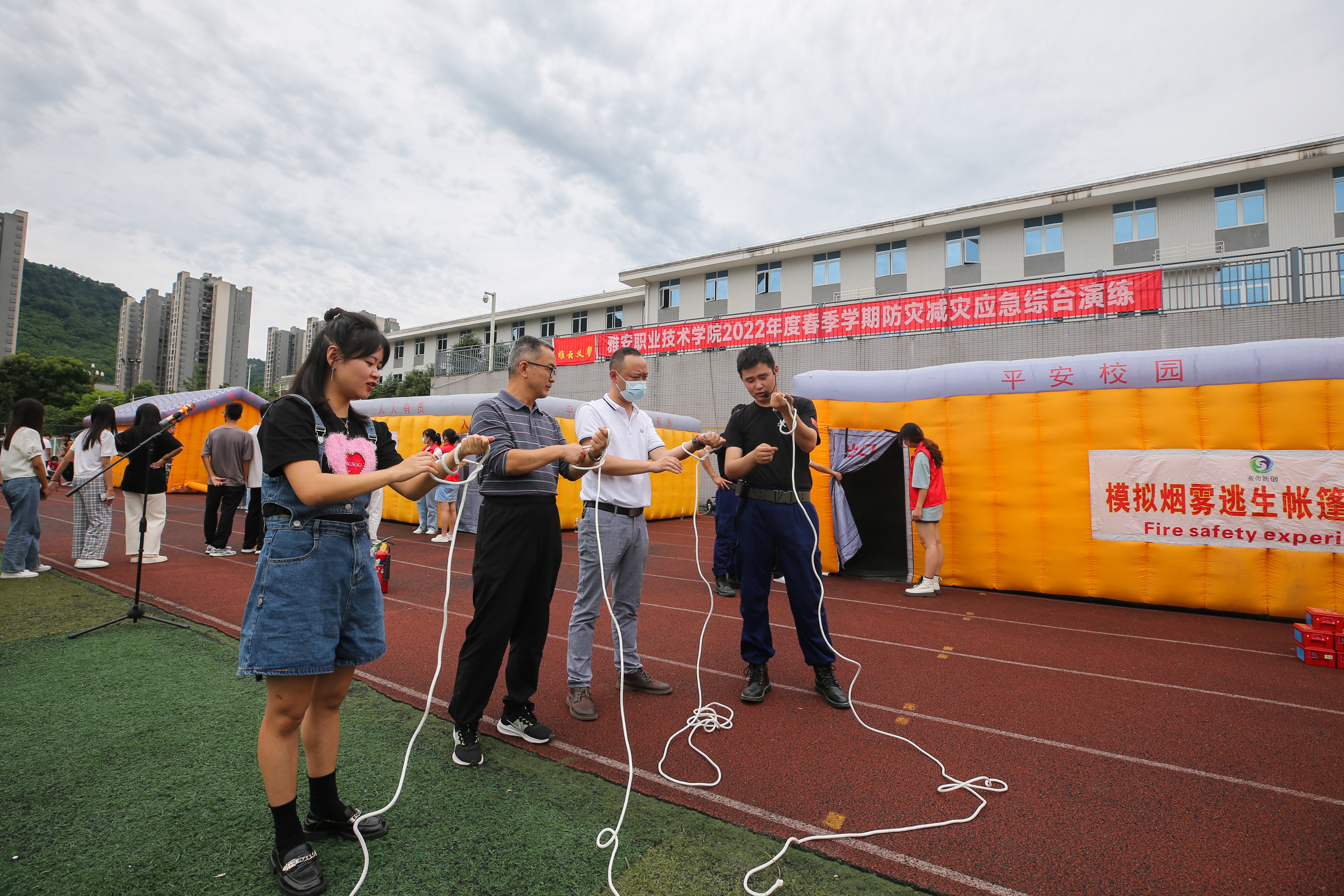 中午12时50分,开演仪式拉开序幕,学院工会主席夏安琼强调了本次演练的重要意义,并宣布演练开始。演练活动分为理论讲解和模拟演练两个部分,教官结合实物对常见灭火器的辨别和消防器材的使用进行了详细讲解后,师生开始了模拟演练,演练项目共有六项,分别为:模拟灭火实操演练、烟雾帐篷逃生演练、仿真消火栓实操演练、消防绳结实操演练、防烟面具佩戴实操演练、小程序线上测评。整个演练过程井然有序,师生在实操演练中掌握了消防器材的使用方法和技巧,提高了安全防范意识和消防能力,通过小程序线上测评进一步巩固了消防知识,了解了更多的消防政策。当天,全体教师和行政人员还参加了防震减灾常识培训,了解并掌握防震减灾和应急救护的相关知识。