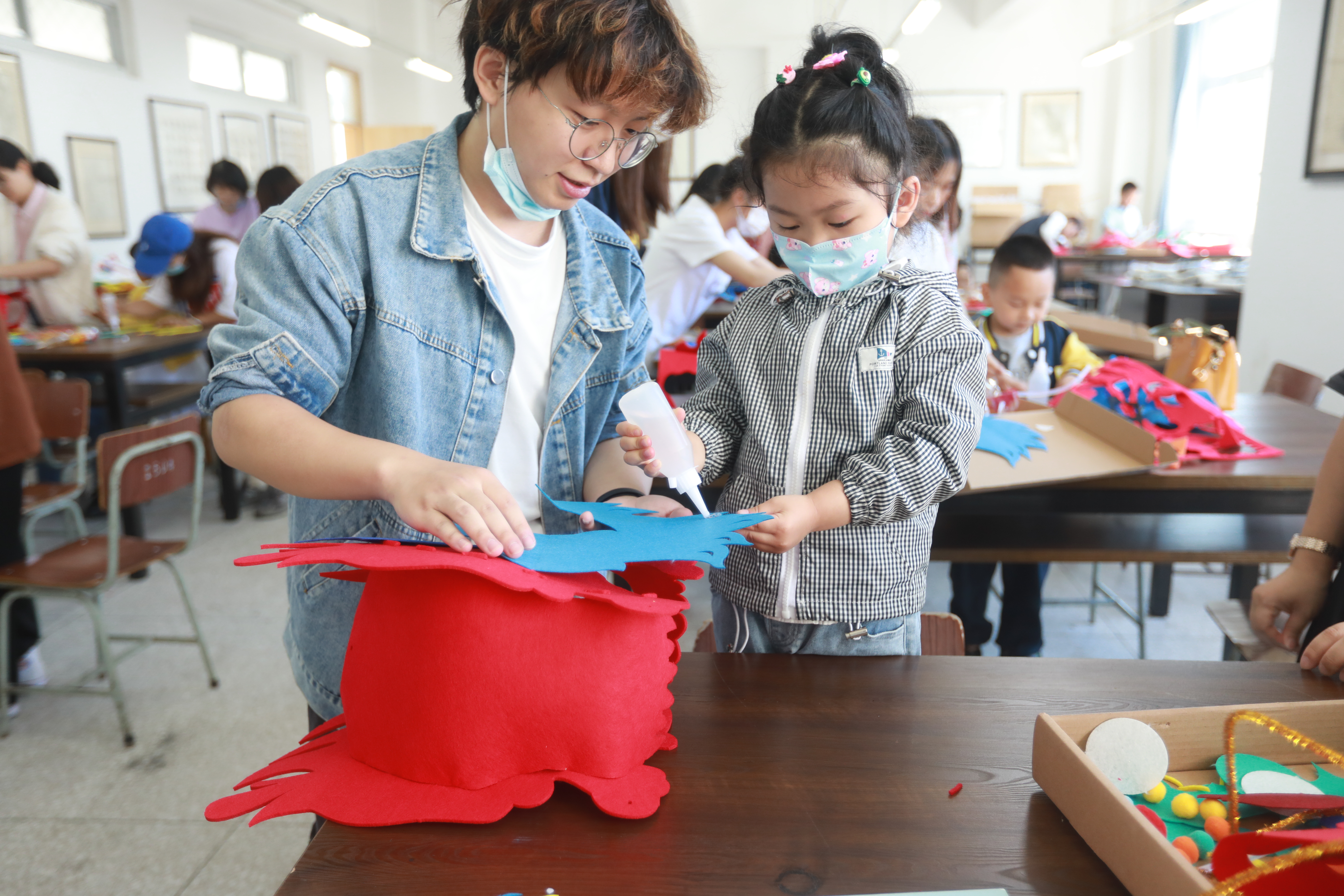 此次活动以“情系六一·浓情端午”为主题,围绕弘扬传统文化和增进亲子关系展开。为配合学院的疫情防控要求,工会办按照分散、小型、分段的原则,在师范学院和基建后勤处工会小组的鼎力支持下,在四个区域设置了手包米粽、制作艾草花束、手工DIY端午舞龙头饰,以及“童心向党”主题亲子绘画等项目。