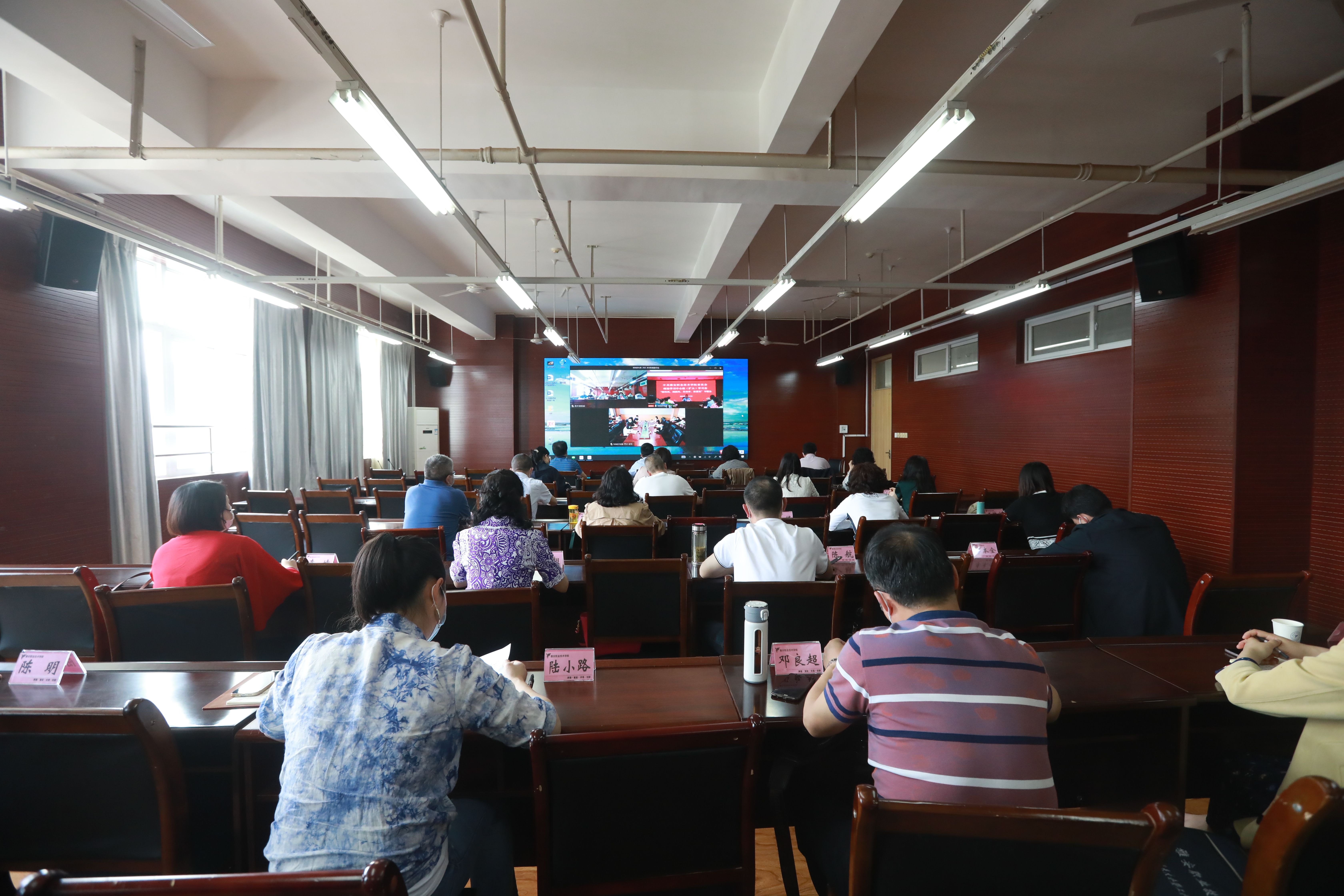 3月17日下午,学院党委理论学习中心组学习(扩大)会暨“转作风、树新风、作表率、抓落实”专题会以视频会的形式分别在经开区校区和青年路校区召开,学院党政班子成员、部分中层干部40余人在经开区校区主会场参会,其他40余名中层干部在分会场通过视频方式参会。会议由学院党委书记李春模主持。