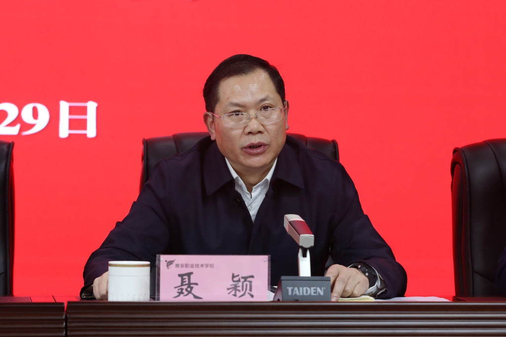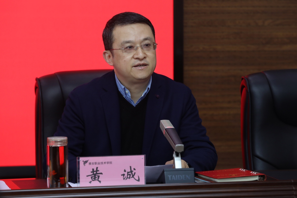 黄诚在表态发言中衷心感谢组织对自己的信任。他表示一定尽快转换角色,认真履职尽责,把雅职院的事业干好,为雅职院的师生服好务。一是坚持党对学院工作的全面领导,把党的领导贯穿在办学治校、教书育人的全过程;认真执行党委领导下的校长负责制,团结班子成员、心系师生员工,用文化暖心、制度管人、流程管事。二是坚守清正廉洁的做人本色,时刻把规矩和纪律挺在前面,省身克己、防微杜渐,坚持原则,带好队伍,与大家一起做到思想上合心、工作上合力、行动上合拍,共同干好事业。三是坚定职业教育的类型发展,结合雅职院已有的办学基础和实际,对标竞进,开拓创新,在建设省“双高计划”中提档升级,实现学院更高质量的发展,为建设四川职教强省、支撑雅安建设“川藏铁路第一城,绿色发展示范市”作出贡献。