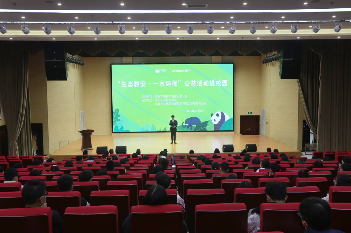 为深入培育和践行社会主义核心价值观,树立广大师生群体绿色低碳的环保意识,为建设富强民主文明和谐美丽雅安贡献力量,12月8日,学院联合新华文轩出版传媒股份有限公司雅安市公司在经开区校区聚雅厅举行“生态雅安•一木环保”公益行动进校园活动启动仪式。学院党委委员、纪委书记杨洪媛,雅安市精神文明建设办公室副主任唐世平出席启动仪式并讲话,学院党委委员、宣传部部长郭英才,新华文轩雅安市公司总经理陈柯参与仪式。学院团委、后勤处负责同志及师生代表90余人参加本次活动。