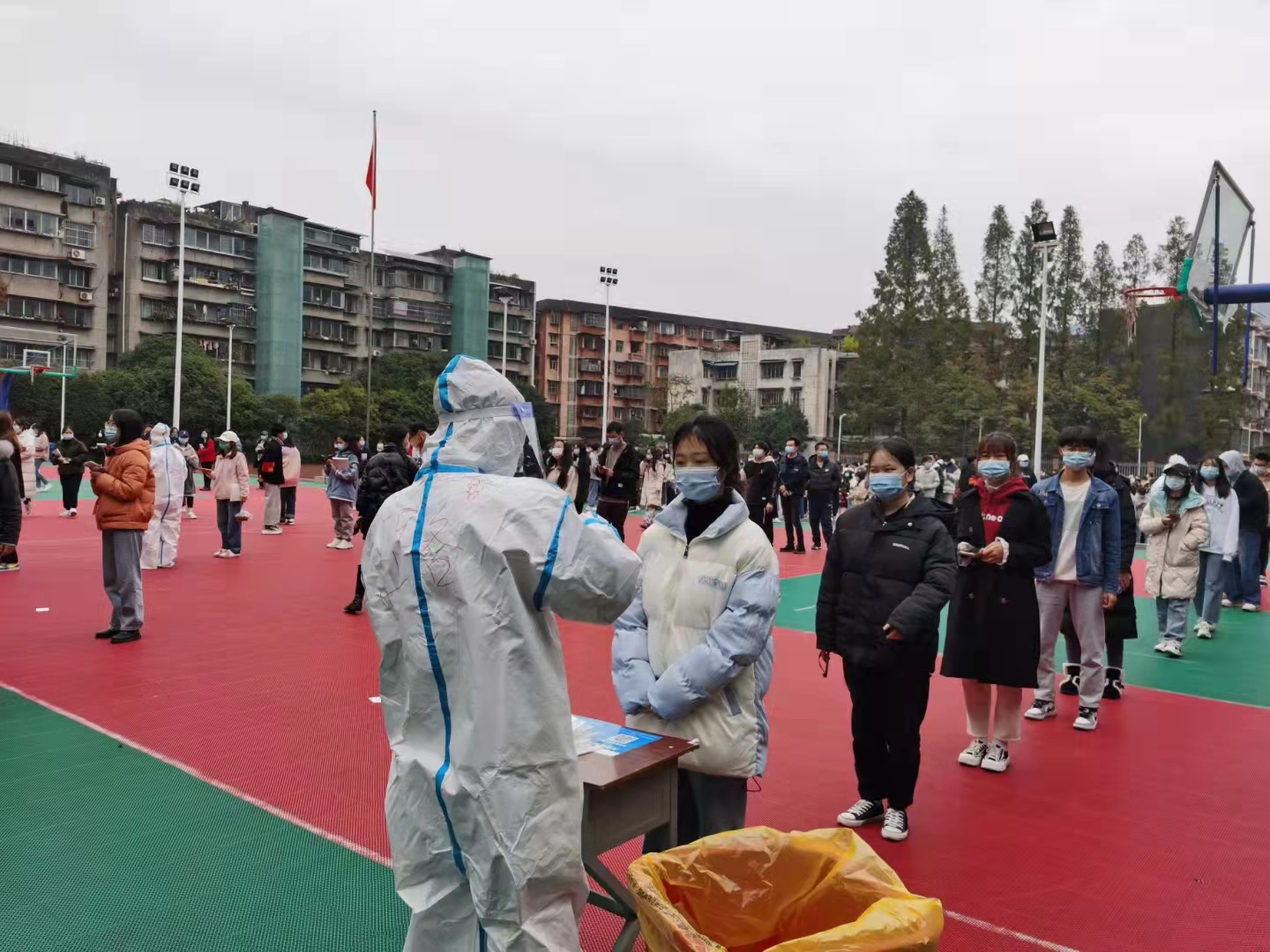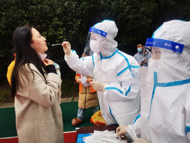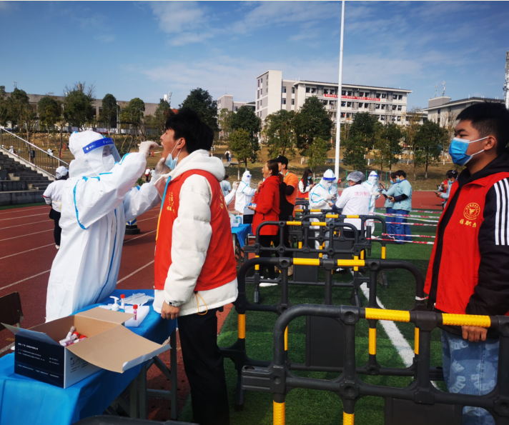 为强化疫情防控细节,确保医务人员及同学们的健康安全,采样过程中,医务人员均穿着密不透风的防护服,为避免上厕所,他们不饮水、不吃饭,核酸采样时间紧、任务重,通过医院有序组织,在艰苦奋战近6个小时后,医护人员短时间内快速为两个学校共计15511名同学完成核酸样本采集。