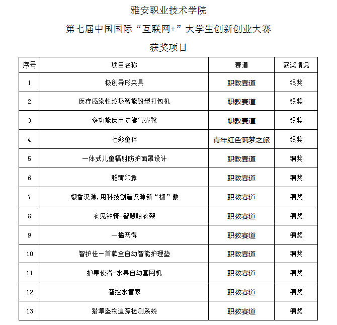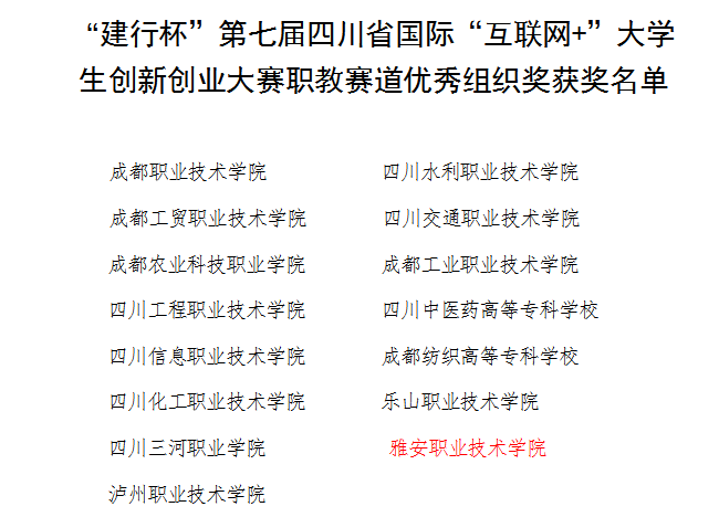 在第七届四川省国际“互联网+”大学生创新创业大赛职教赛道比赛中,学院参赛项目获得4银9铜的好成绩,学院荣获优秀组织奖。