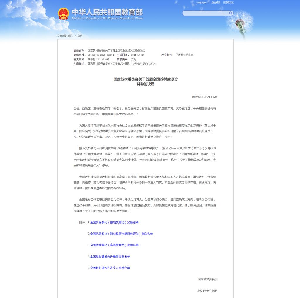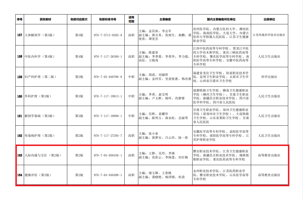 10月12日,教育部公布国家教材委员会关于首届全国教材建设奖奖励的决定。beat365护理学院王静副教授主编的《人际沟通与交往》一书获得首届全国优秀教材二等奖。2020年开展的首届全国教材建设奖评选,是新中国成立以来首次设立全面覆盖教材建设各领域的专门奖励项目,也是全国教材建设领域的最高奖。