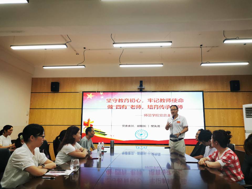 为进一步推进党史学习教育的深入开展,7月14日上午,党委委员、副院长樊先茂深入联系部门师范学院开展座谈调研,并结合分管工作实际,以《坚守教育初心,牢记教师使命,做“四有”老师,培育传承新师》为题,在青年路校区B207,为师范学院党员及教师代表上了一堂生动的专题党课。
