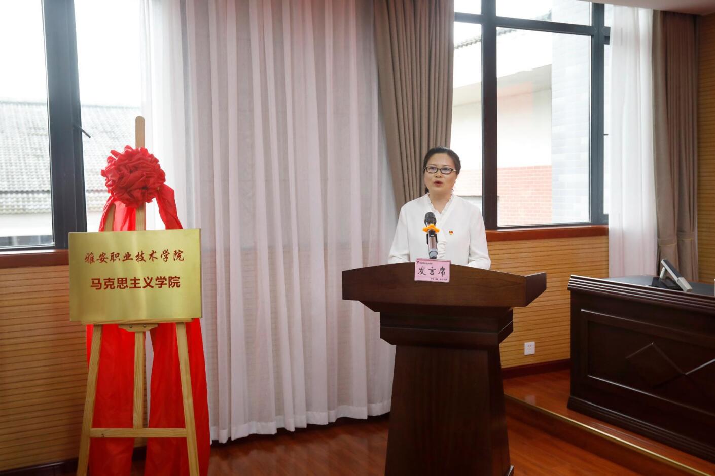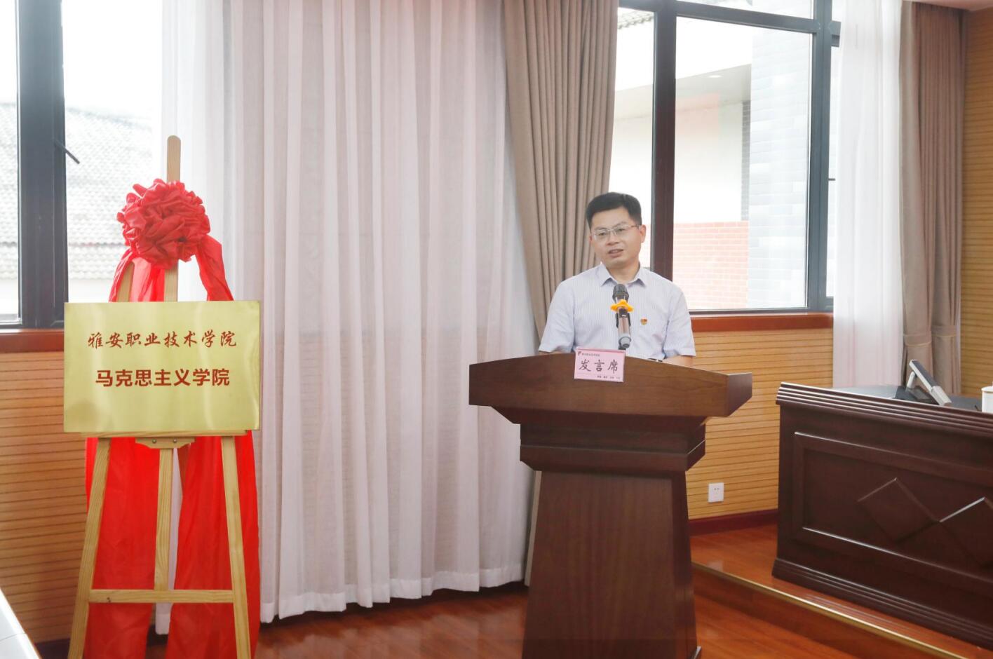 学院党委书记李春模在致辞中指出,学院党委决定在原思想政治理论课教学部的基础上成立马克思主义学院,旨在进一步加强学院思想政治教育工作,提升思想政治理论课建设水平,不断构建“大思政”育人格局。这不仅是名称上的变化,更是学院坚持社会主义办学方向、落实立德树人根本任务、培育和践行社会主义核心价值观、持续推动学院高质量内涵式发展、引导广大青年学子更好践行“请党放心、强国有我”誓言的重要举措。他对马克思主义学院的建设发展,提出坚持政治建院、坚持质量立院、坚持人才兴院、坚持管理治院等“四个坚持”要求,表示学院将以此次马克思主义学院成立为契机,进一步深入贯彻党的教育方针和省委、市委全会精神,解放思想、勇于担当、善作善成,努力争创省“双高”院校,为雅安建设“三个高地”、发展“四大经济”、打造“五宜幸福地”提供更加有力的技术技能人才支撑。