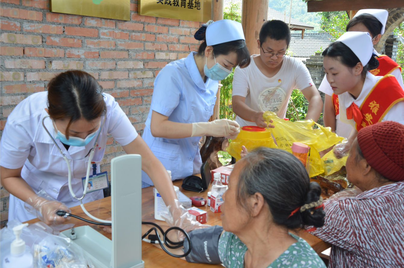 由护理学院师生组成的医疗义诊服务队为近百名村民进行义诊,免费测量血糖血压,开展健康知识宣讲。