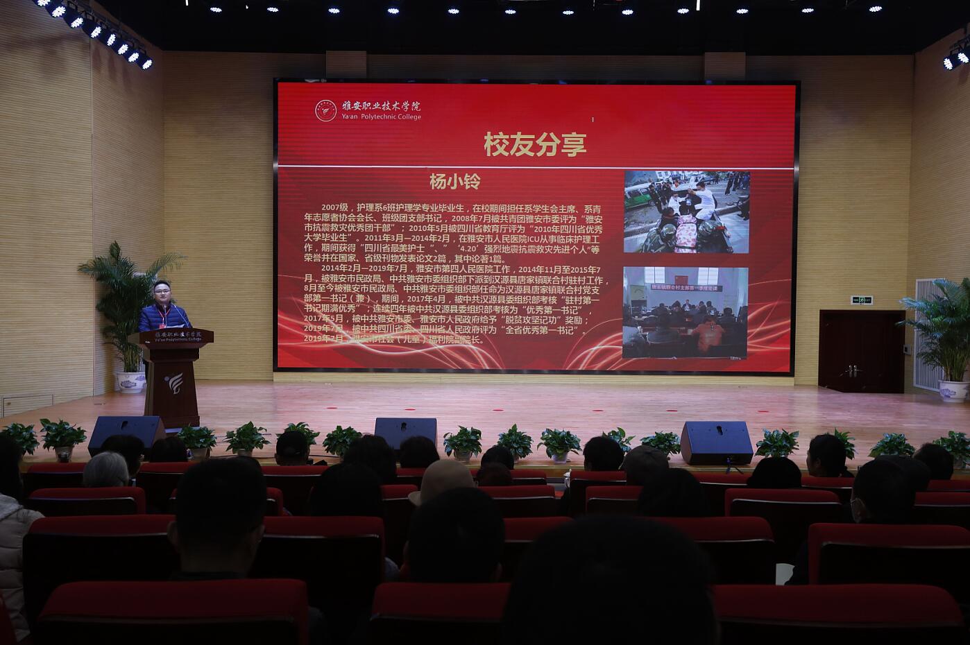 2007级护理专业毕业生、雅安市社会(儿童)福利院副院长、“全省优秀第一书记”杨小铃,2009级医学检验技术专业毕业生、重庆金域医学检验有限公司区域业务部部门经理苏俊,2012级针灸推拿专业毕业生、雅安市人民医院医生邹汛,2012级特殊教育专业毕业生、四川爱贝比托育教育科技有限公司总院长汤林,2017级卫生信息管理专业毕业生、昱景装饰广告公司创始人白宇豪分别作了分享,传递了友情与价值,分享了成绩与喜悦,共同回望雅职无悔青春,展望雅职锦绣未来。