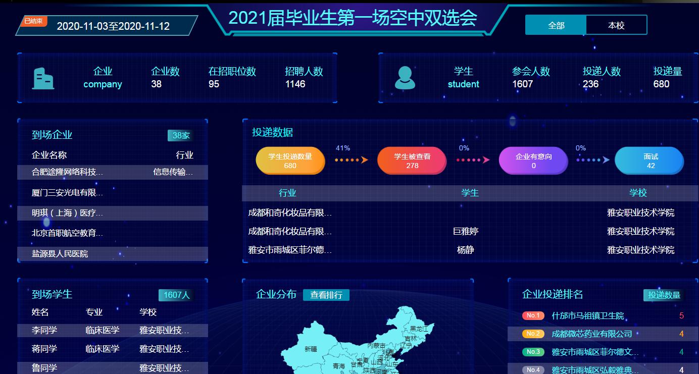 参加本场双选会的学生共有 1607 人,参与投递的人数共有 236 人,在线投递简历共 680 份。本场空中双选会,学院不仅及时告知了2021届毕业生,还向未就业的往届毕业生发出了参会邀请,保证毕业生就业工作离校不离线,让毕业生都能找到适合自己的工作岗位。