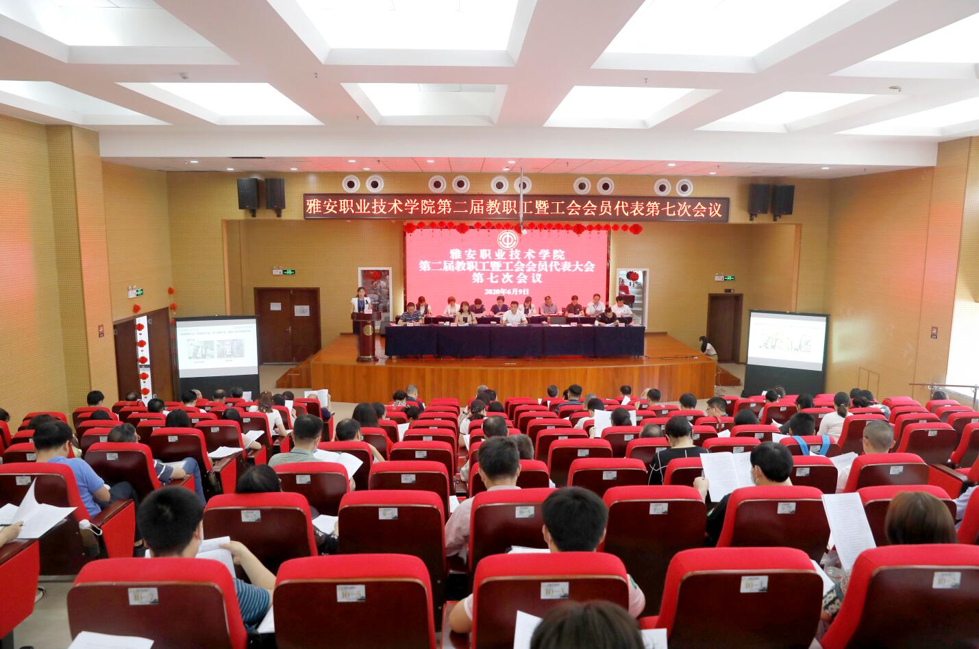 6月9日,beat365在线唯一官网第二届教职工代表暨工会会员代表大会第七次会议在青年路校区培训中心5楼博雅厅召开。学院党政领导、正式代表、列席代表共114人参加了大会。会议由学院党委副书记、工会主席付洪涛主持。