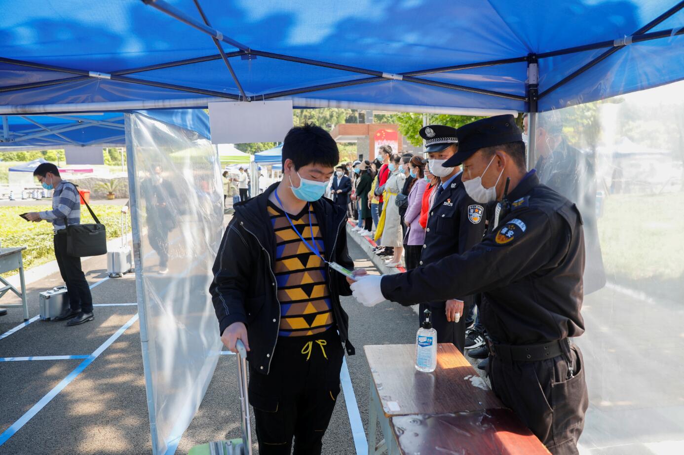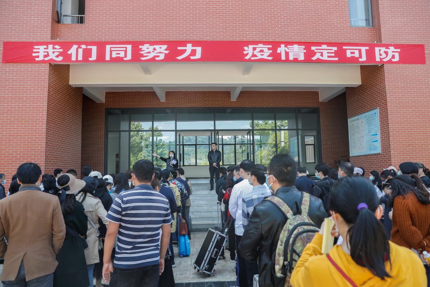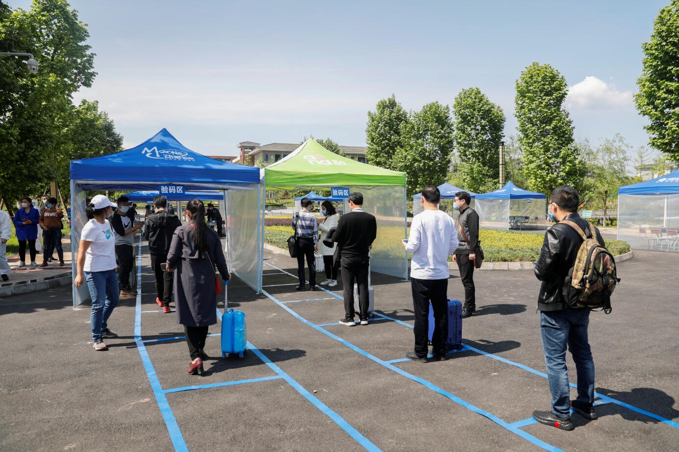 在演练现场,由教师扮演的“学生”按校门标识标牌有序排队进入,按照“一测二查三核四通过”的报到原则,进行体温检测、查验健康码、核实学生证和报到注册,正常者有序入校,异常学生进入观察区,防控办工作人员进行风险评估,评估无风险者,进入报到注册区,有风险者,电话告知发热门诊,发热门诊接诊到发热学生,按流程进行报告,相关部门按流程进行处置。