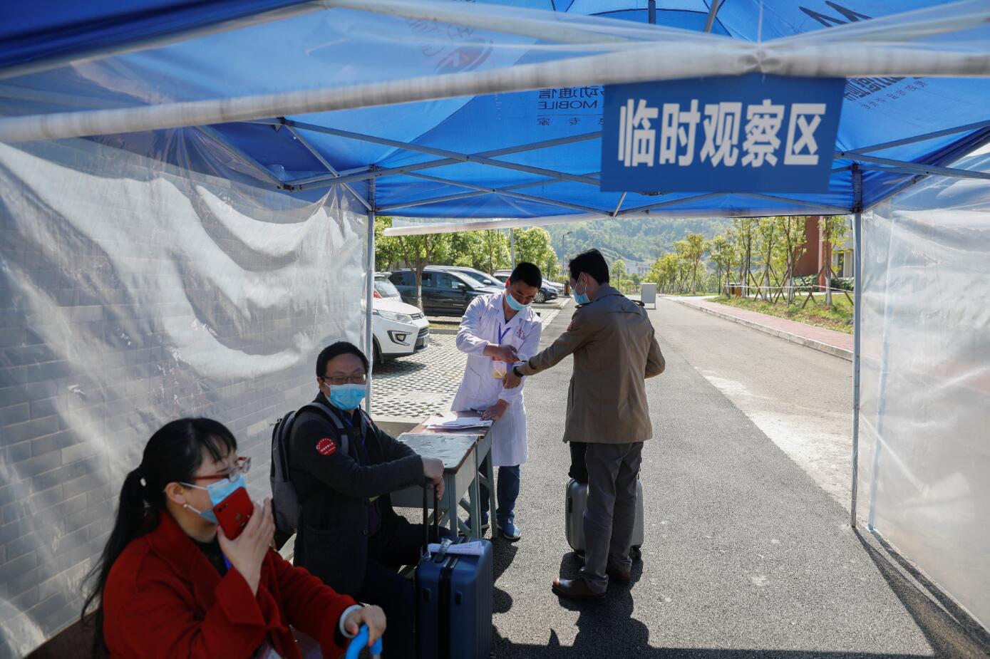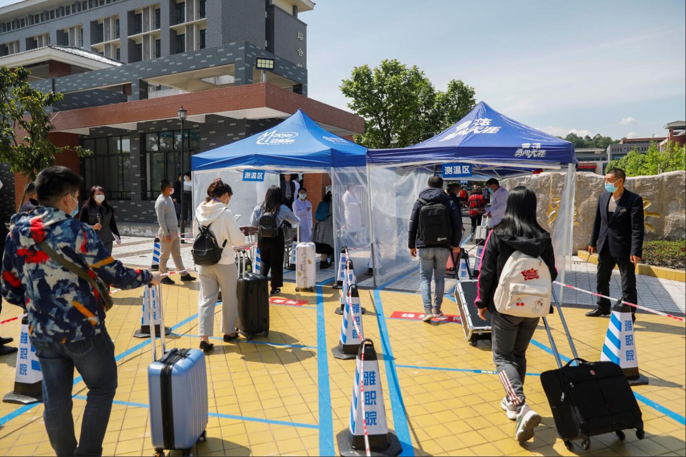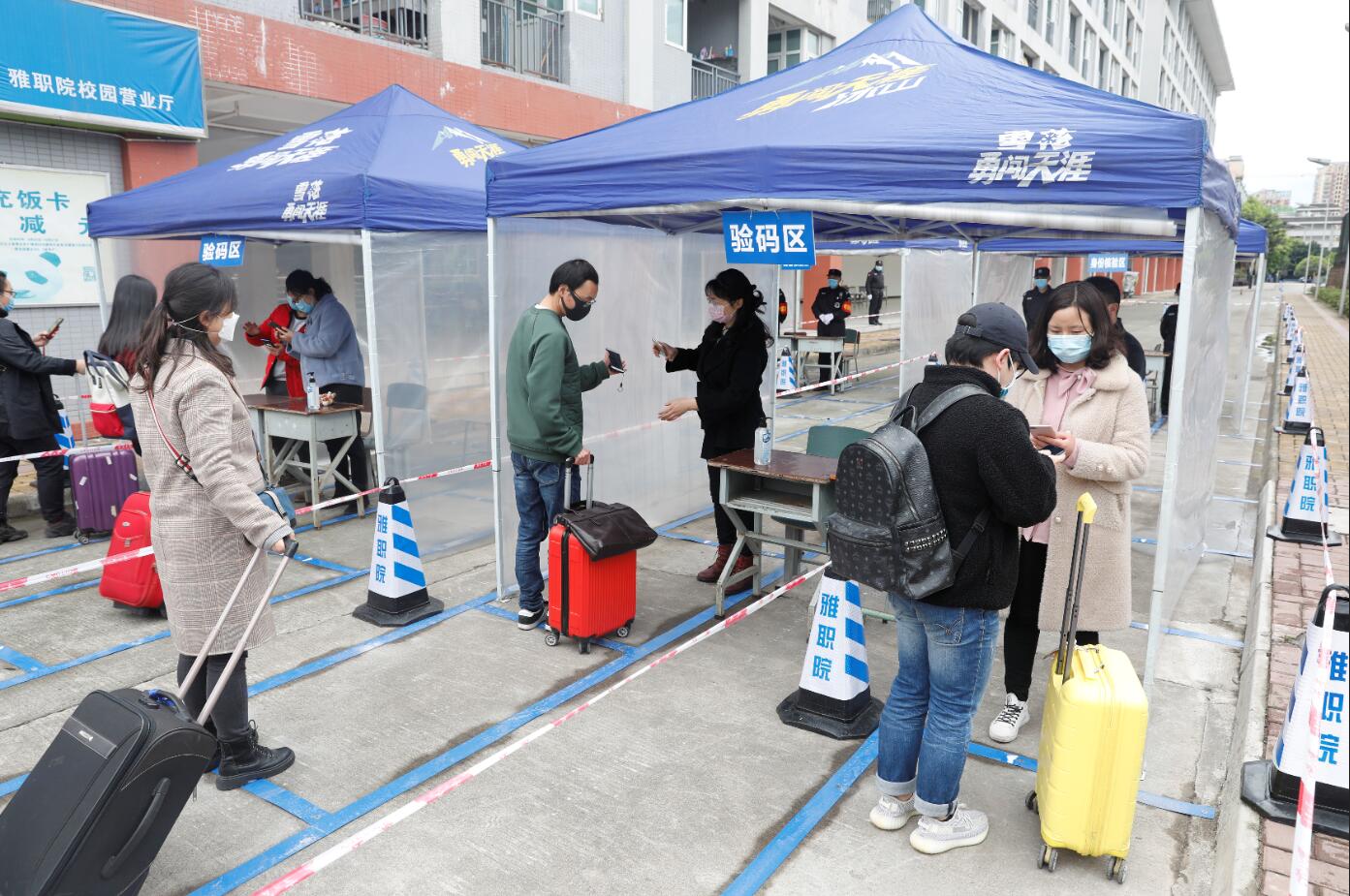 在演练现场,由教师扮演的“学生”按校门标识标牌有序排队进入,按照“一测二查三核四通过”的报到原则,进行体温检测、查验健康码、核实学生证和报到注册,正常者有序入校,异常学生进入观察区,防控办工作人员进行风险评估,评估无风险者,进入报到注册区,有风险者,电话告知发热门诊,发热门诊接诊到发热学生,按流程进行报告,相关部门按流程进行处置。