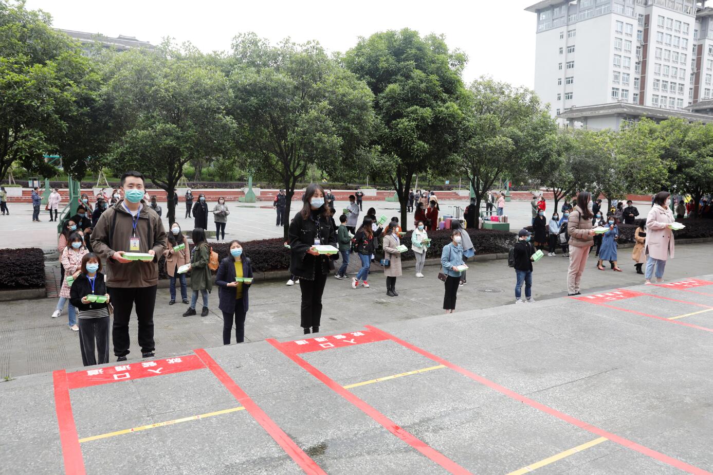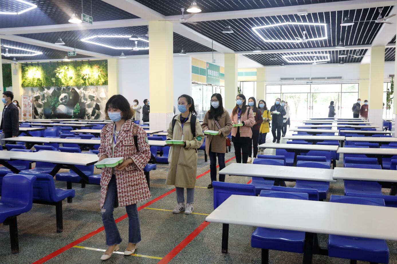 在学生食堂就餐环节,学生按食堂入口按标识标牌有序排队,测温正常者进入,学生自带餐盒打餐,打餐完毕后按规划出口将餐带出食堂或在食堂内就座用餐。