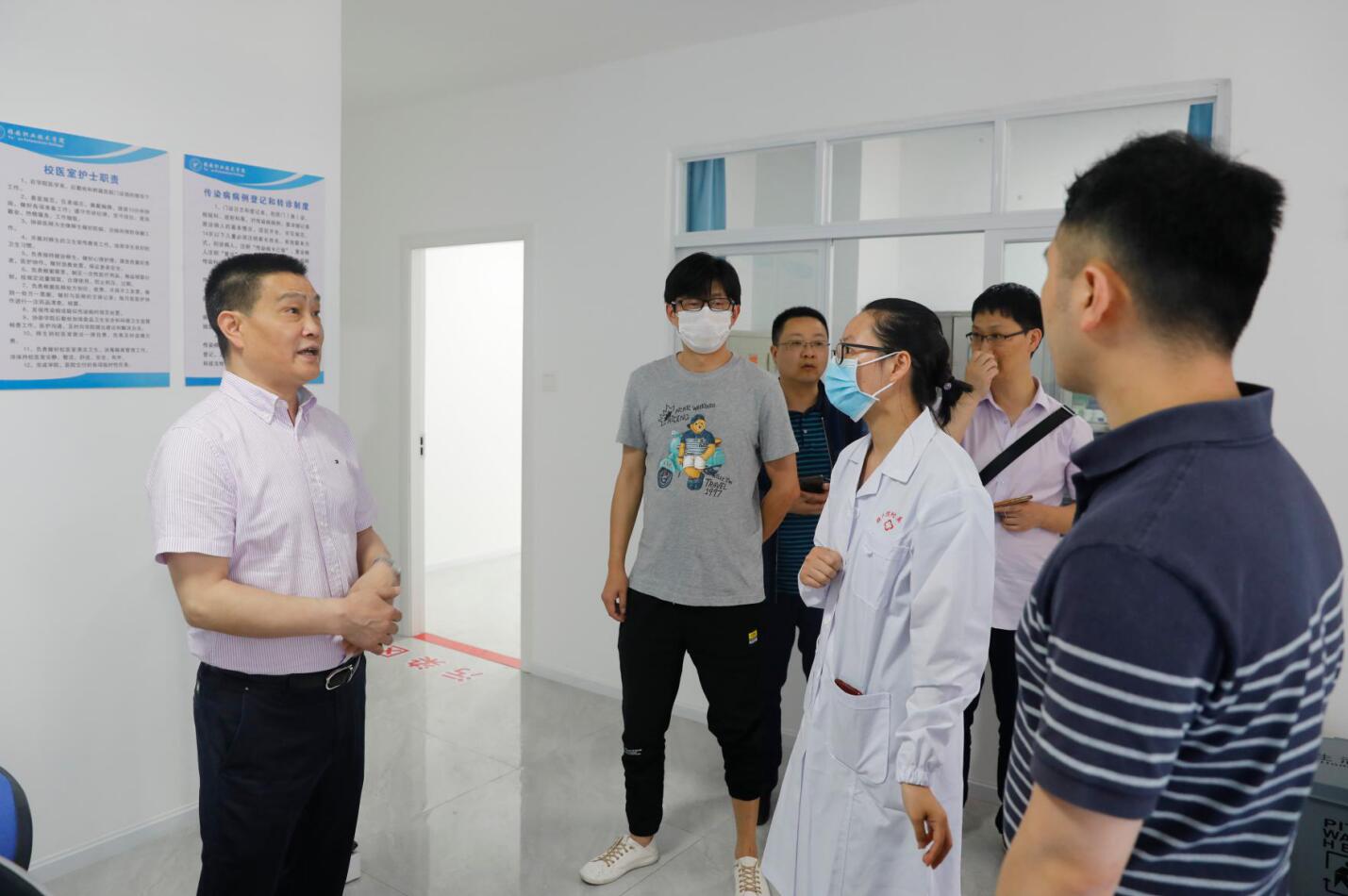 李春模一行实地检查了学生宿舍、食堂、校医室、教室、防疫物资储备区域等场所,详细询问了宿舍管理、校园安全、防疫物资准备、医护人员配备、日常排查、学生就餐等情况。检查中,李春模再三强调要时时绷紧疫情防控这根弦,确保各类隐患排查整改到位,为学生开学返校创造安全有序的条件。