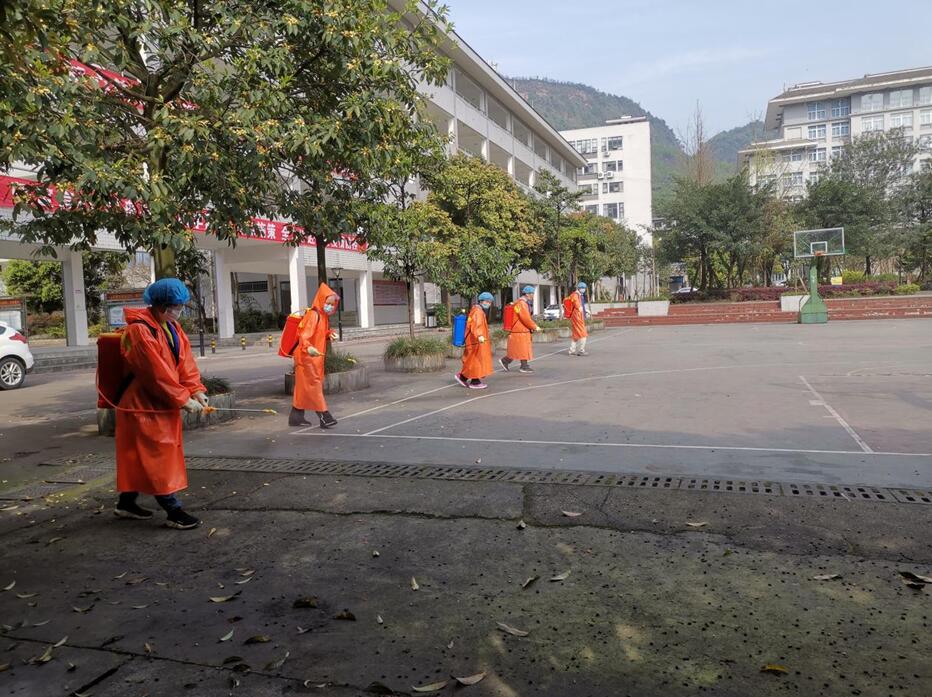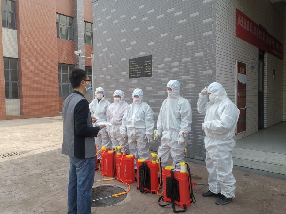 董赟参照《四川省教育系统防控新型冠状病毒感染肺炎疫情确保开学安全的工作预案》,详细讲解了消毒工作基础知识、操作要点。从防护服的穿脱和消毒液的特性以及存放等基本知识开始,按照消毒流程详细讲解了消毒液的配制、喷雾器的使用、不同环境的消毒规范及技巧,并进行了实际演练。