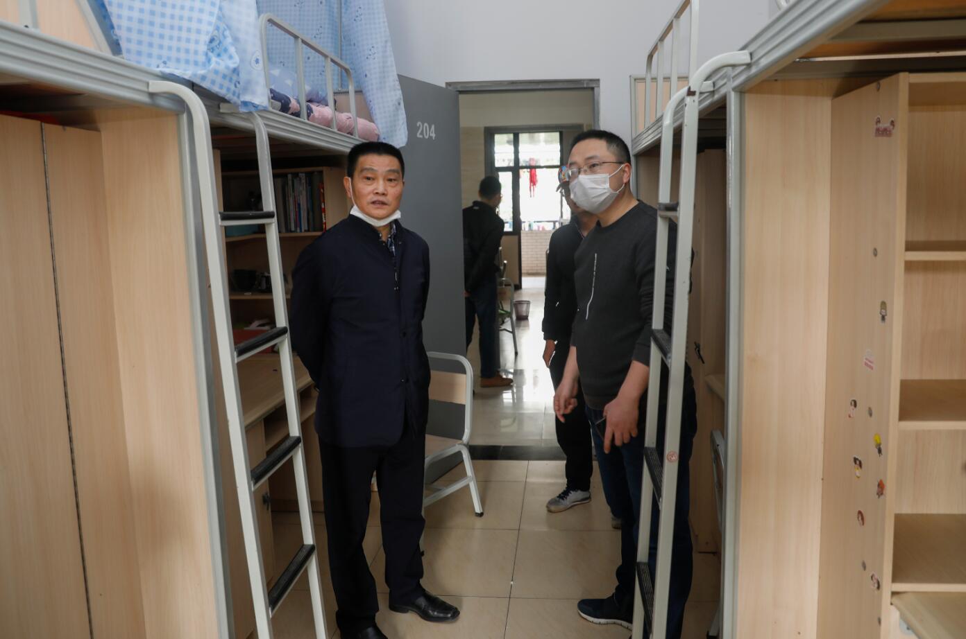 李春模强调,受新冠肺炎疫情影响,运动场建设项目延期复工,施工单位要注意时间节点,按照建设方案,挂图作战,倒排工期,抓紧施工,既要保障生产建设,又要做好疫情防控,确保如期安全高效完成项目建设。李春模实地了解了宿舍布局及学生住宿情况,对楼层通道通风、安全监控等提出要求,他强调,学生、后勤、保卫部门要密切配合,加强对学生宿舍的管理,做到宿舍通风、通道畅通、环境清洁,牢牢守住学生宿舍疫情防控重要防线。