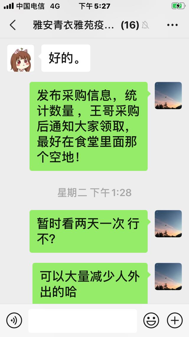 人间烟火味,最是暖人心,张科宏老师把菜送到了家,也把爱送到了家,更是点燃了大家心中的热情。这些天,青衣雅苑业主群内热闹非凡,除了及时分享疫情方面的信息,发布蔬菜、水果、鸡蛋、酒精等采购信息,口罩购买等咨询信息的不断地霸屏。正如一个业主所说,“守望相助,给青衣雅苑的邻居们点赞。”