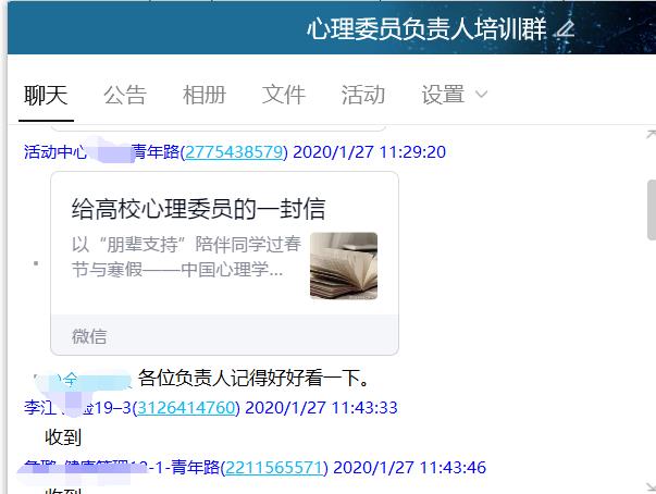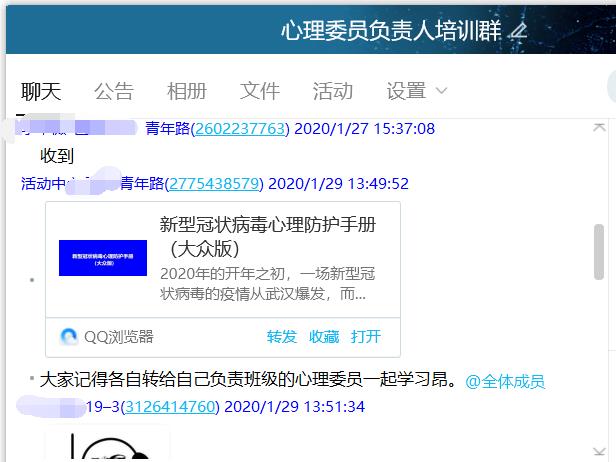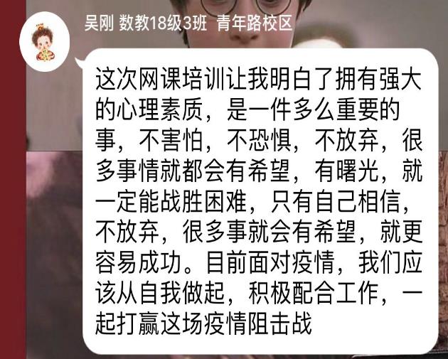面对疫情,学生可能会遇到各种心理挑战,心理中心积极发挥朋辈支持力量,对全院各班级心理委员开展了网上培训,普及心理辅导与支持常识。同学们积极响应,认真学习,纷纷表示,新冠肺炎疫情防控心理知识培训改变了他们的生活方式,也使他们获得了心理知识,减少了焦虑与失序,促进了成长。