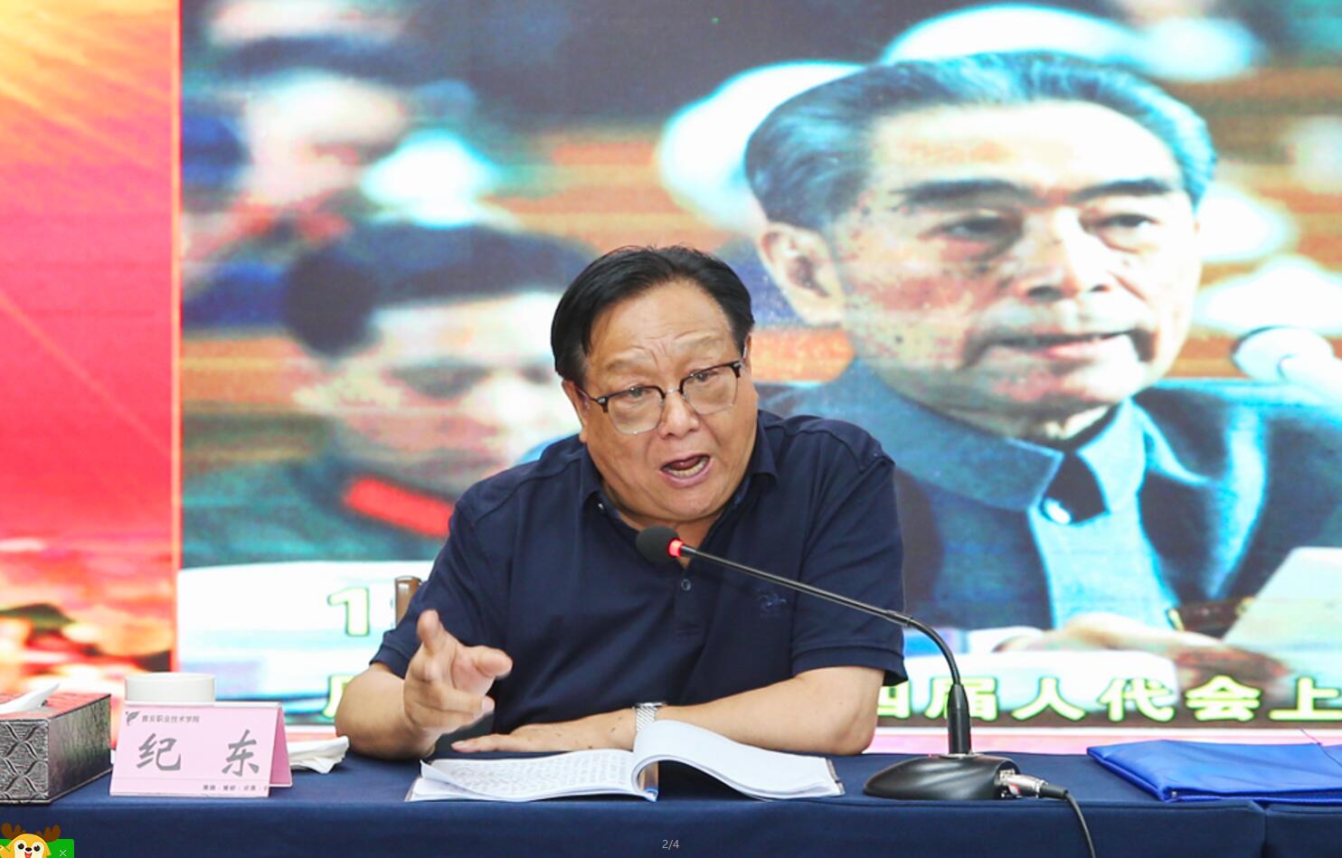 在学院即将开展“不忘初心,牢记使命”主题教育之际,9月9日,学院举行2019年第10次党委中心组(扩大)学习会,邀请武警指挥学院原副院长、周恩来总理生前秘书、中共中央文献研究会周恩来思想生平研究分会副会长纪东少将来到学院,在青年路校区培训中心5楼集雅厅做了题为《弘扬周总理精神风范,以初心和使命引领未来——在周总理身边工作八年的感悟》的专题讲座。学院党委班子成员,中层干部,各党总支(直属党支部)委员、党支部委员代表、民主党派负责人、思政部等二级学院(部)教师代表100余人聆听了讲座。讲座由学院党委书记李春模主持。