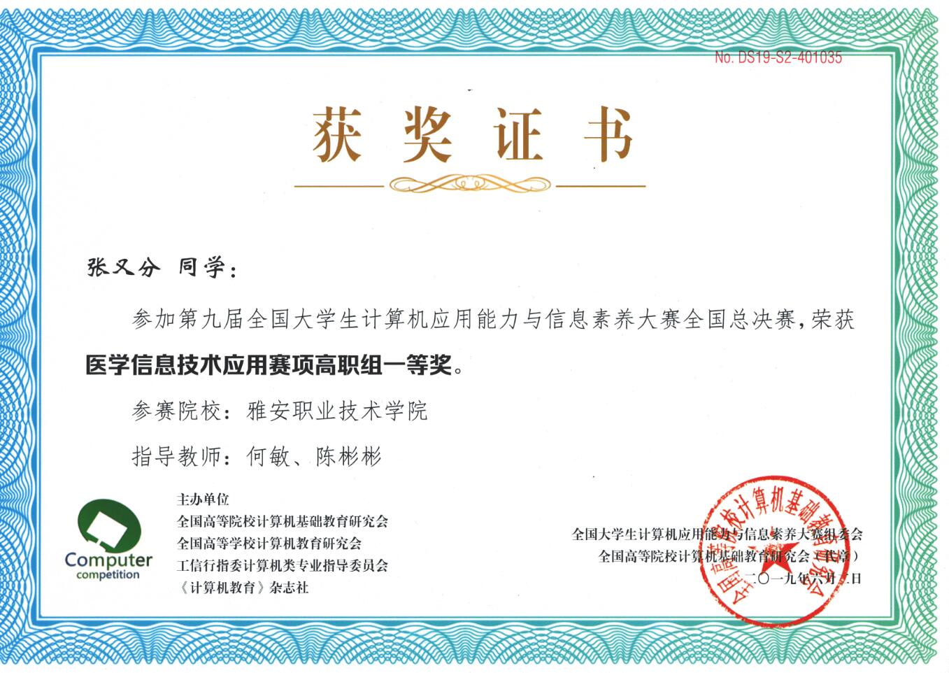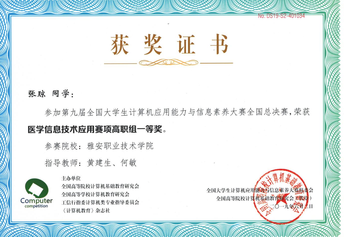 日前,在由全国高等学校计算机教育研究会、工信行指委计算机类专业指导委员会主办的第八届全国大学生计算机应用能力与信息素养大赛上,智信学院卫管专业的张琼、张又分及医疗设备专业的游茗荃3名同学,分别荣获医学信息技术赛项2个一等奖和1个二等奖,学院代表队获团体二等奖。