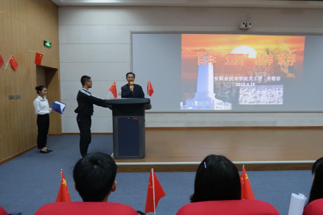 4月18日,学院关工委常务副主任、原学院党政办主任、副教授张敬春同志为智能制造与信息工程学院的学生作了《百年“五四”精神永存》的主题讲座。教育引导青少年树立和践行社会主义核心价值观,团结教育广大青少年坚定不移听党话跟党走。