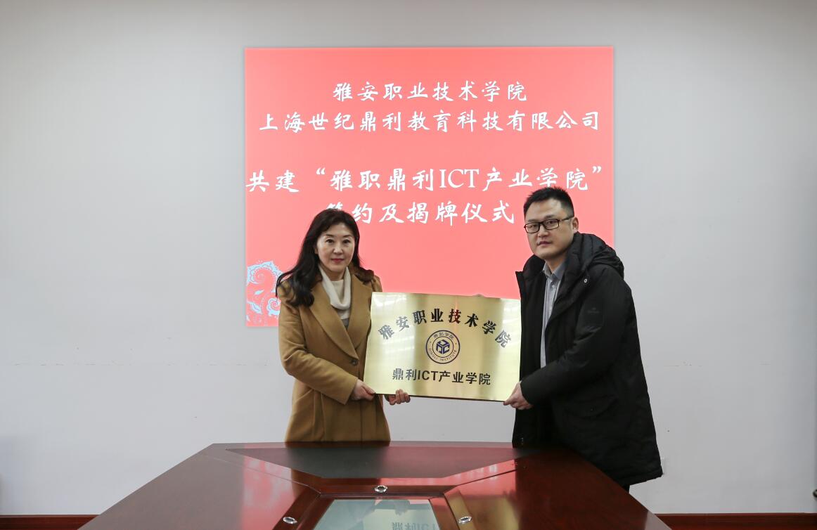 最后,刘红代表学院与上海世纪鼎利教育科技有限公司签订了共建“雅职鼎利ICT产业学院”协议,石静院长与鼎利刘勇军总经理共同为“雅职鼎利ICT产业学院”揭牌。