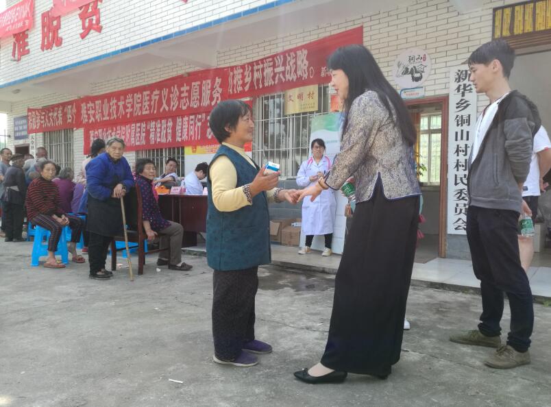 上午9:20,工作组来到新华乡铜山村,“精准脱贫 健康同行”医疗义诊志愿服务队的医务人员们在村委会门口的空地上搭建起就诊点,眼科、五官科、儿科、内科、皮肤科五个专科的医疗专家为铜山村的村民们讲解健康知识、初步诊断病情,给予用药指导,并有针对性地为患者发放药品。与此同时,付洪涛一行与铜山村两委负责人、村第一书记等进行了座谈,结合村委提出的2018年脱贫工作计划进行了商议。付洪涛指出,铜山村在去年顺利完成了“村摘帽”的任务,目前还有6户贫困户要在今年实现脱贫,学院将继续巩固脱贫攻坚已取得的成效,一如既往做好精准扶贫工作。会上对“六一”、“七一”将开展的党建联建活动进行了具体工作对接。