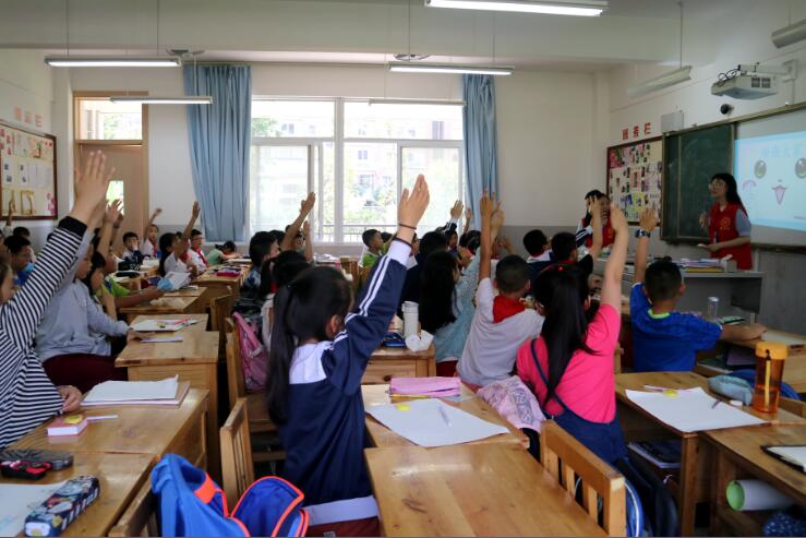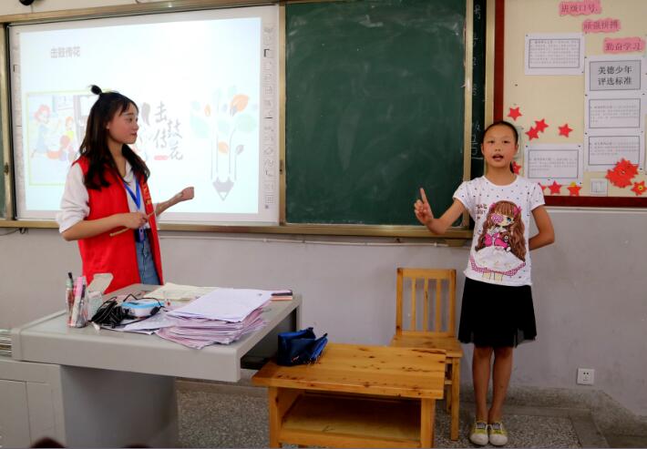志愿者分成三个小队,分别进行了感恩教育课、卫生清洁教育课、书法绘画课的讲授。她们用生动形象的PPT为孩子们开启了一次特殊而有意义的课堂。感恩教育课上,孩子们背诵《游子吟》,讲述刚过去的母亲节为母亲做的事。志愿者巧设“我想对父母说”环节,让孩子们在活动中学会感恩;卫生清洁课上,开展了“爱清洁,讲卫生”主题班会教育活动,介绍了路边摊和辣条等三无产品的危害。随后,进行了卫生清洁知识趣味抢答,气氛融洽和谐,孩子们在增长知识的同时又学会了保护自己;书法绘画课上,志愿者为孩子们讲解了中国书法的成就造诣,再用听写汉字、用指定物品画画、趣味画图猜字游戏的方式,培养孩子们的书法绘画能力和爱国情怀。课堂上,孩子们和志愿者积极互动,大家一起度过了一个美好的下午时光。