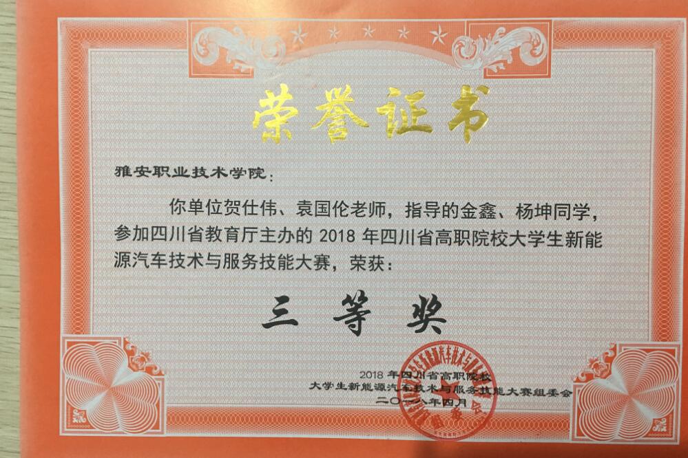 【本网讯】4月13日-15日,四川省教育厅主办的2018年四川省高职院校大学生“新能源汽车技术与服务技能大赛”在德阳举行,全省32所高职院校共派出32支队伍参赛。学院机电系派出贺仕伟、袁国伦老师带队,从“汽车维修工匠先锋班”中选拔出学生金鑫和杨坤参加团体比赛,经过两天的激烈比赛,金鑫、王坤团队获得团体三等奖。