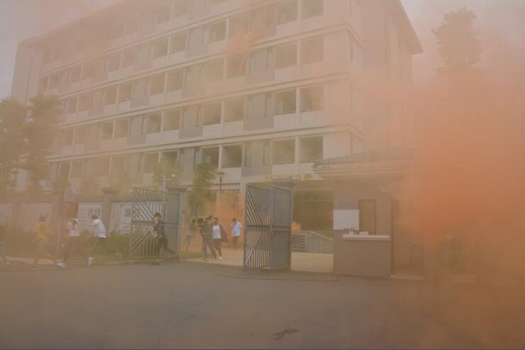 本次演练设青年路校区和经开区校区两个场地同时进行。下午14:30分,防灾减灾应急疏散演练正式开始,全体师生听到疏散指令后,按照事先设定的疏散路线,在各楼层指导老师的带领下,快速有序地撤向安全地带,“被困”人员在窗口挥舞毛巾发出求救信号。学院义务消防队员快速反应,设立安全警戒标志,进入火场进行初期火灾扑救和救援。