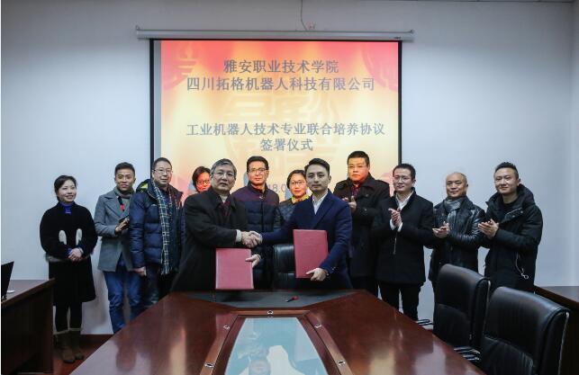 【本网讯】为紧跟现代制造技术发展,培养适应工业结构转型所需的高技能人才,校企经过深入的洽谈、交流和实地考察。2月2日,学院与四川拓格机器人科技有限公司签订工业机器人技术专业联合培养协议,学院党委委员副院长刘红、党委委员成培处处长宋立智、教务处处长彭裕红、招生就业处处长宋峰以及机电系相关负责人、拓格公司总经理唐伟一行5人出席签约仪式。