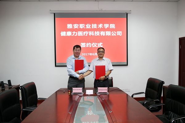 樊先茂与主海文分别代表校企双方签署了“健康力医疗设备维修订单班”合作办学协议。