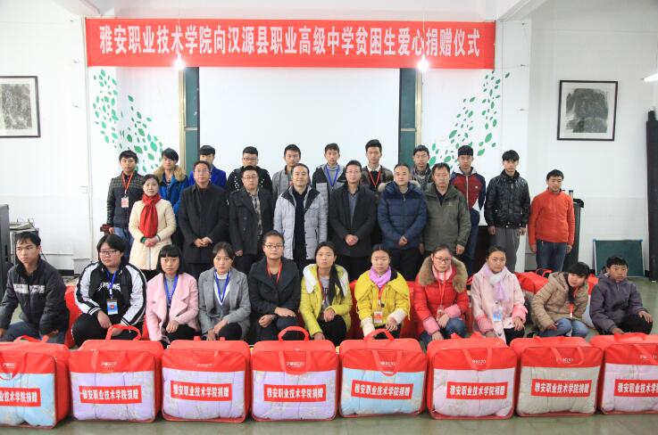【本网讯】12月26日,学院党委书记张大凯、纪委书记谭宏、成人教育与培训处副处长勒伟、机电系机电与汽车教研室主任唐翠微(驻点挂职)等一行到汉源县职业高级中学开展精准扶贫工作,慰问贫困学生,举行了爱心捐赠仪式。参加捐赠仪式的有汉源县人民政府副县长龚荣高、汉源县职业高级中学校长李俊武及相关负责同志和22名受捐助贫困学生。