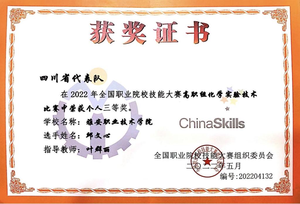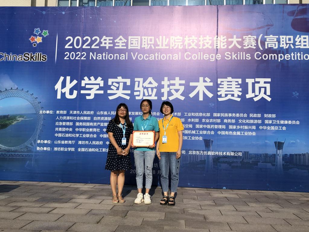 8月15日至16日,教育部主办的2022年全国职业院校技能大赛(高职组)化学实验技术赛项在潍坊职业学院举行,来自全国56所院校的56名选手参赛。beat365药学与检验学院2020级药学专业学生邱文心作为四川省代表队选手之一参加比赛,经过两天三个子赛项的激烈角逐,最终斩获三等奖,为四川省在2022年国赛上再添一奖!