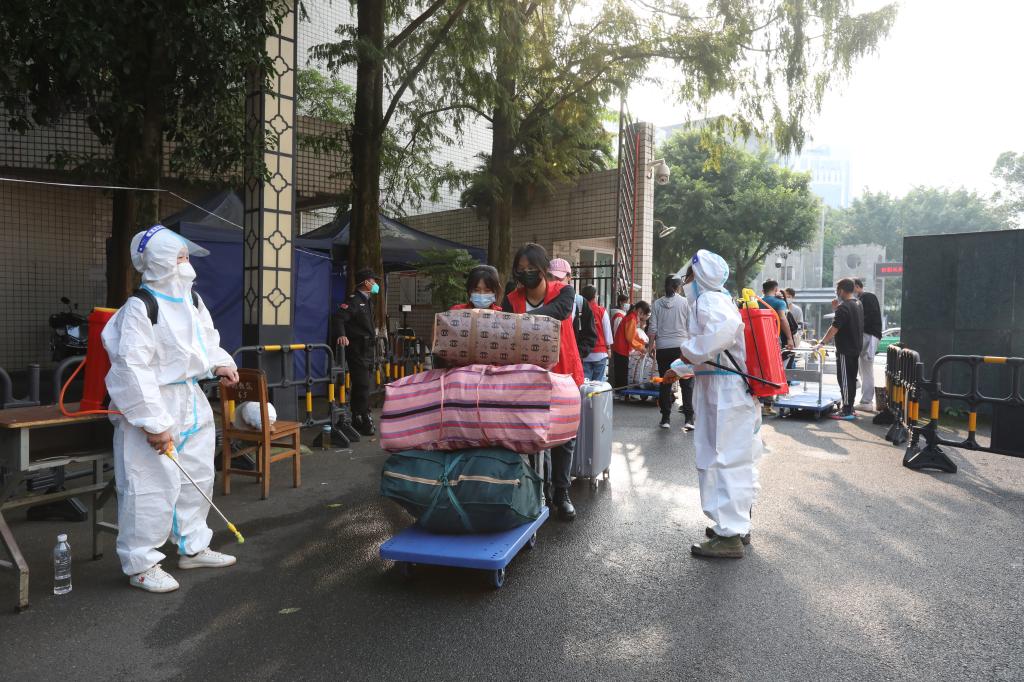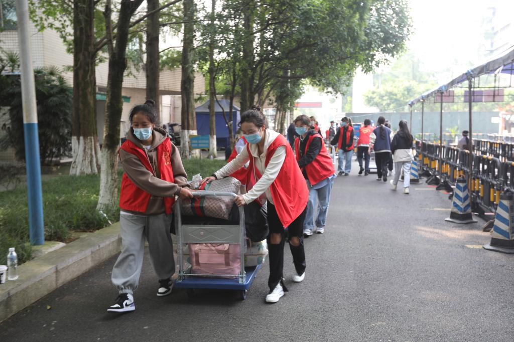 教师志愿者们在校门口负责指导协助学生完成进校核验流程以及维持进校通道畅通。在这里能感受到依依不舍的离别情,也能体会到青春昂扬的凌云志。“孩子们,排好队不着急”、“孩子,这个推车上是你的行李,跟着我走”,“家长您放心,我们一定会照顾好你们的孩子”……志愿者老师们在迎新志愿服务的过程中一遍又一遍的重复着这些话语。