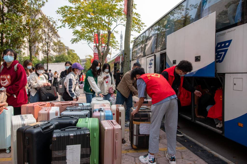 各二级学院按照学生转运到各校区的时间,妥善安排学生志愿者为返校学生运送及拿取行李。