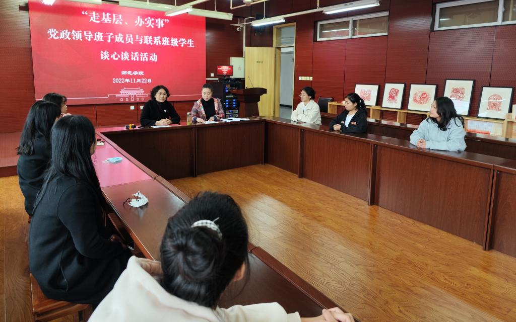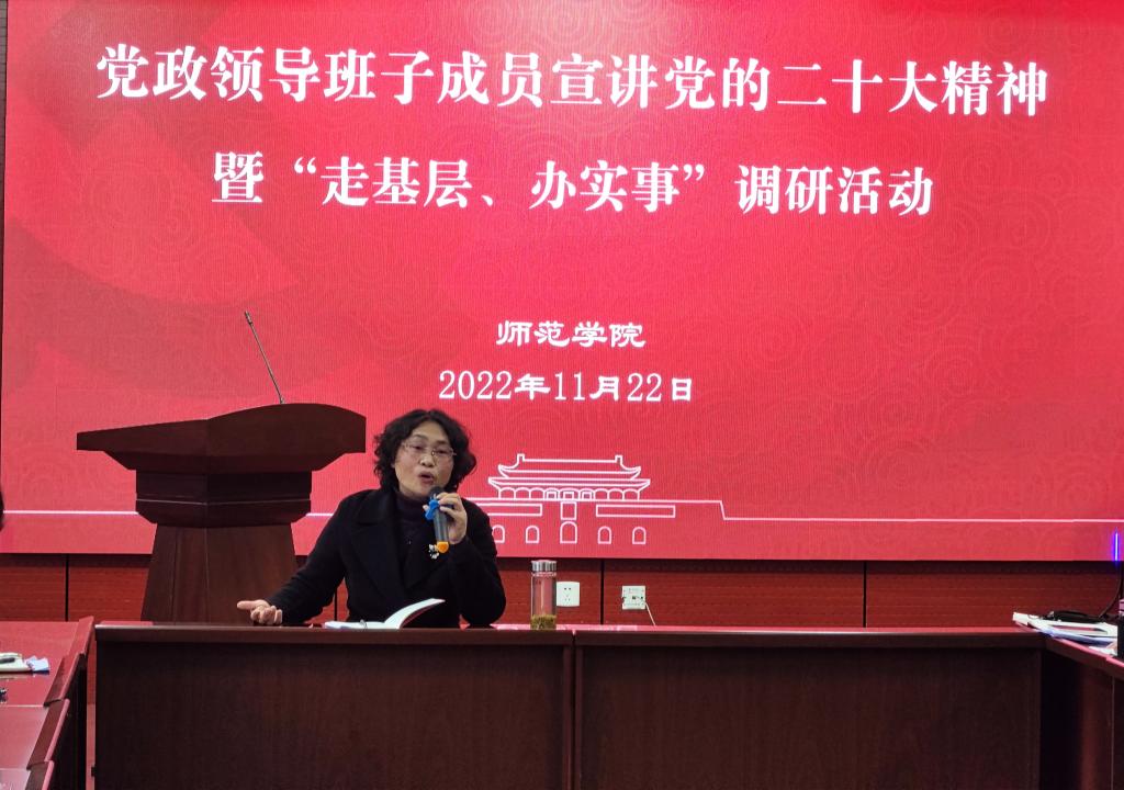 11月22日,学院工会主席夏安琼在青年路校区图书馆903会议室为师范学院全体教职工宣讲党的二十大精神,并与师生谈心谈话。师范学院党总支书记陆小路主持会议。