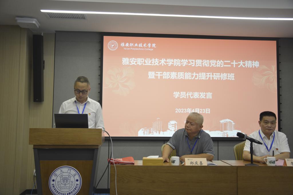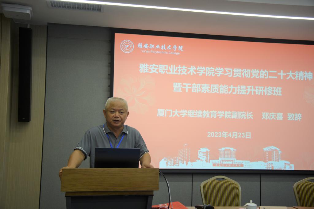 为进一步深入学习贯彻党的二十大精神,认真开展好学习贯彻习近平新时代中国特色社会主义思想主题教育,丰富和拓展党委中心组理论学习和干部培训学习的内容、形式和载体,不断提高学院干部队伍的政治站位、党性修养、综合素质和业务能力,4月23日上午,以“学习贯彻党的二十大精神 凝心聚力争当职教排头兵”为主题的beat365在线唯一官网学习贯彻党的二十大精神暨干部素质能力提升研修班开班式在厦门大学克立楼6号报告厅举行,学院党委书记李春模作开班动员讲话,厦门大学继续教育学院副院长郑庆喜致欢迎辞。学院部分党政班子成员和中层干部共计39人参加本期研修班。