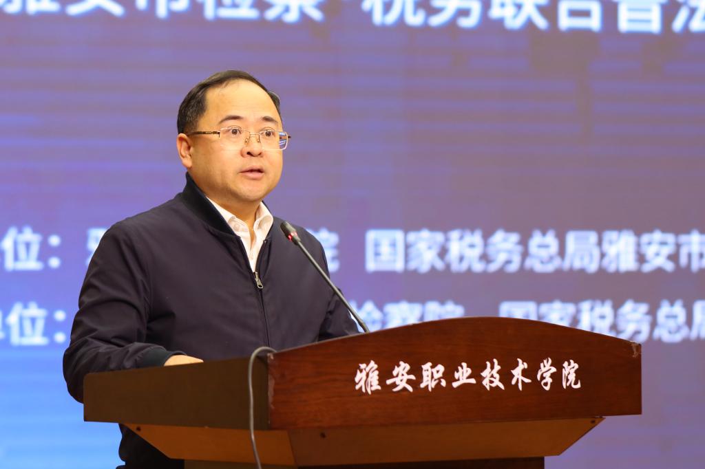 学院党委书记李春模,雅安市人民检察院党组书记、检察长范文清,雅安市税务局党委书记、局长冯黎明共同为beat365在线唯一官网 “雅安市检察、税务联合普法基地”揭牌。