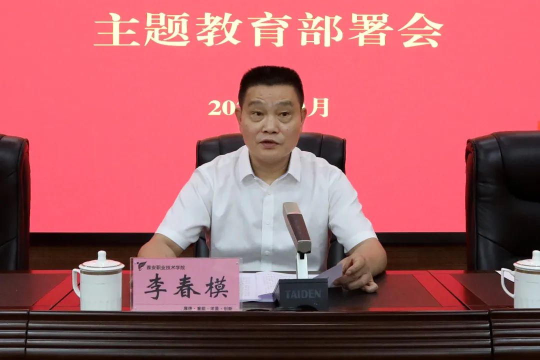 李春模强调,牢牢把握主题教育的主题主线,要切实做到以学铸魂,自觉做习近平新时代中国特色社会主义思想的坚定信仰者、积极传播者、忠实实践者;切实做到以学增智,真正把马克思主义看家本领学到手;切实做到以学正风,以党的优良作风带动作风教风和师德师风向上向好;切实做到以学促干,以省“双高计划”建设为统领,对标职教二十条和提质培优行动计划,夯实内涵建设,努力打造川西职教高地和高素质技术技能型人才聚集高地,为职业教育大发展和雅安“一区一地”现代化建设作出新的更大贡献。
