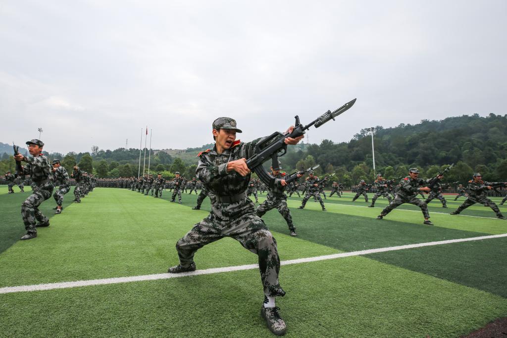 伴随着雄壮激昂的分列式进行曲,56支方队步伐铿锵、口号响亮,依次通过主席台接受检阅,展示出2023级新同学砥砺奋进、昂扬向上的精神面貌。特色方队进行刺杀操、擒敌拳、匕首操和班组战术等军训科目展演,同学们招式威猛、拳脚带风,全场气势磅礴、声势浩荡,迸发出青春力量!他们用健康的肤色、饱满的精神、整齐的步伐、昂扬的斗志,交上了大学生涯第一份满意的答卷。