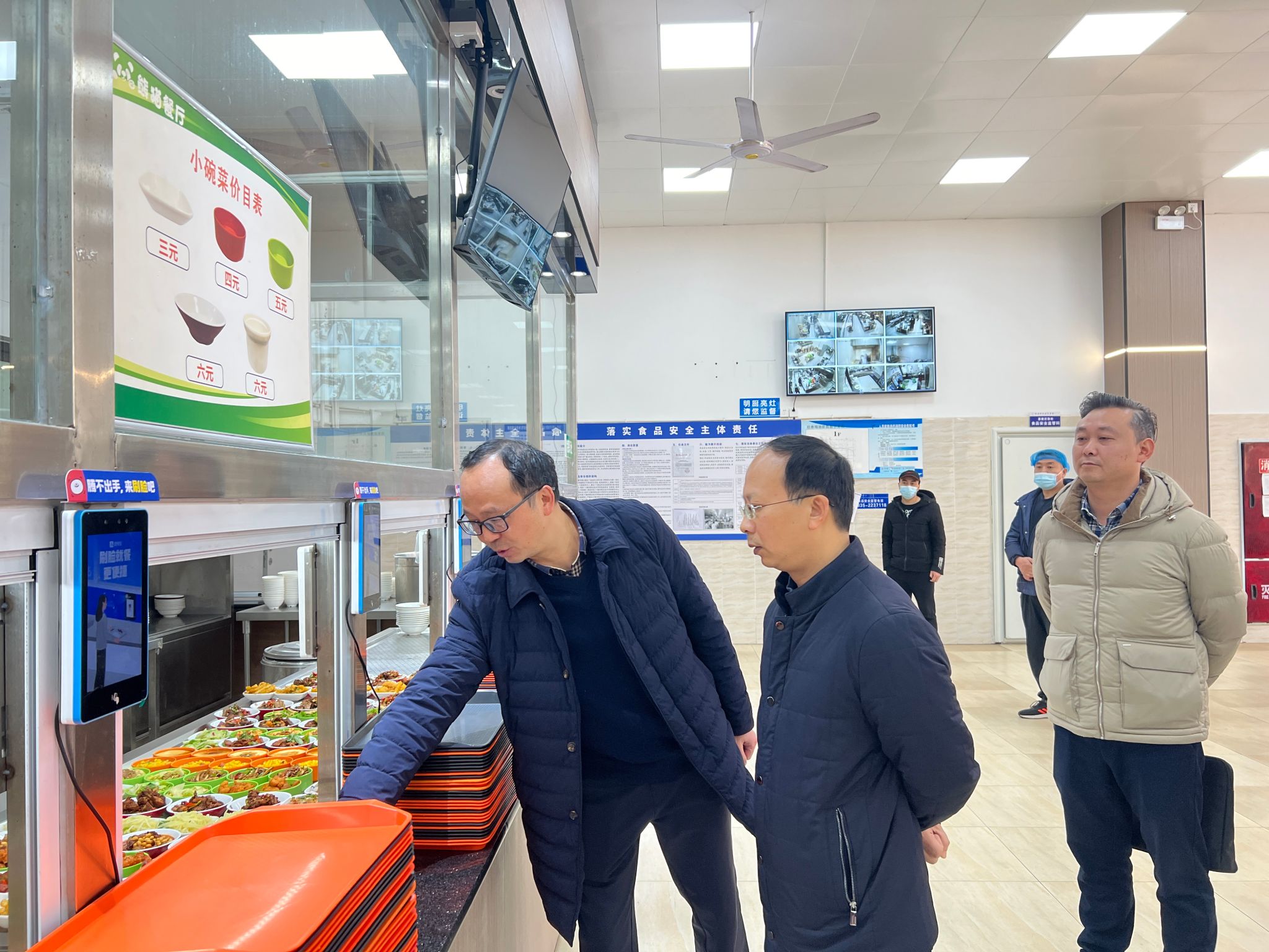 张军向邓朝金一行介绍了近期学院食品安全工作情况。邓朝金一行实地查看学院食堂厨房操作区、库房、售卖区等地,详细了解学院“两个责任”落实情况。